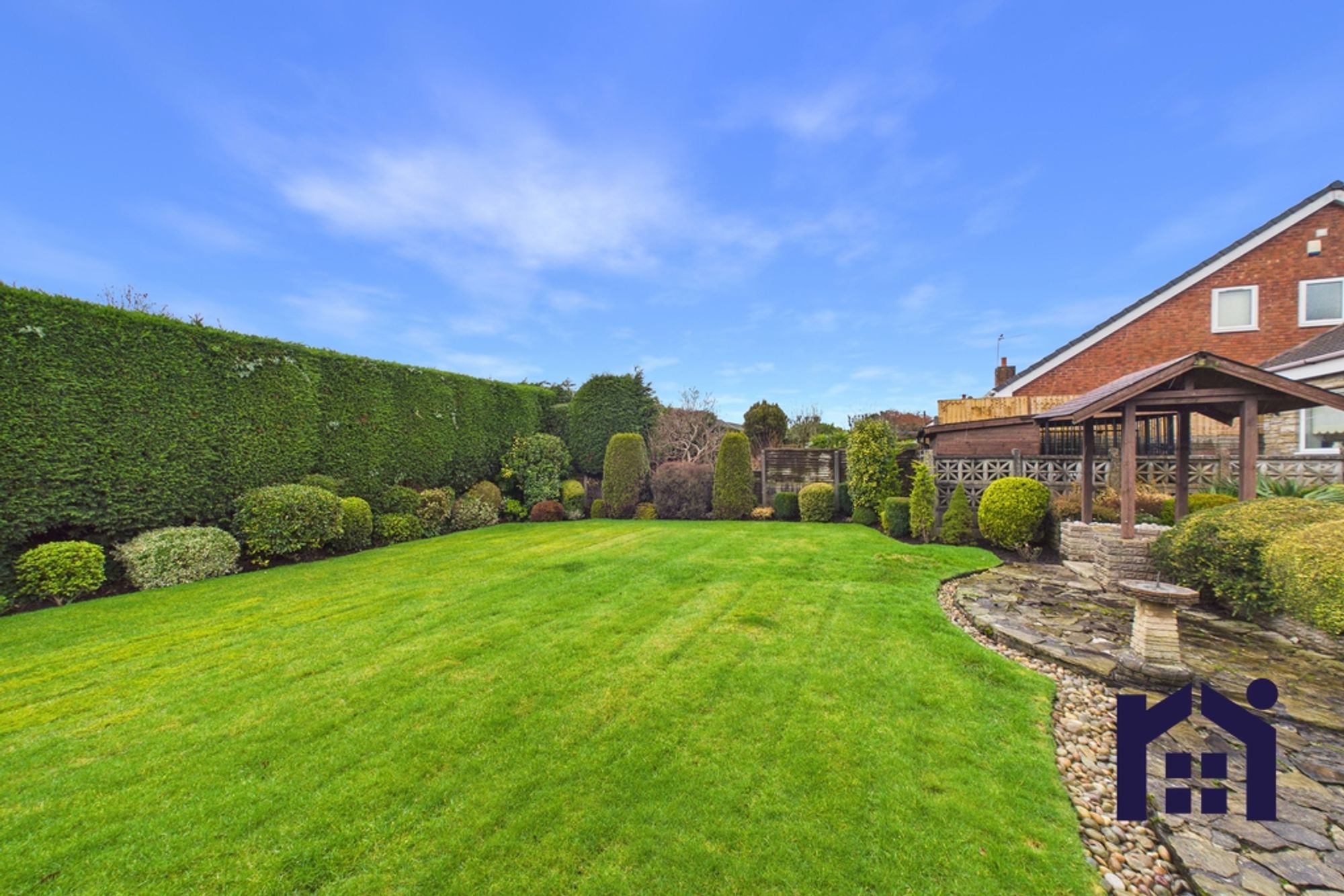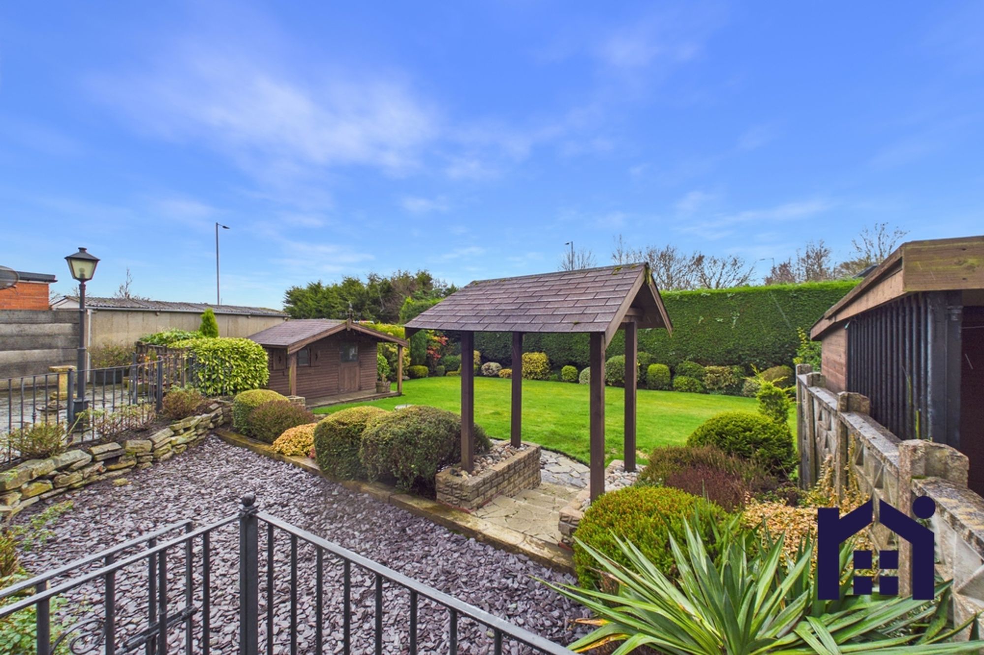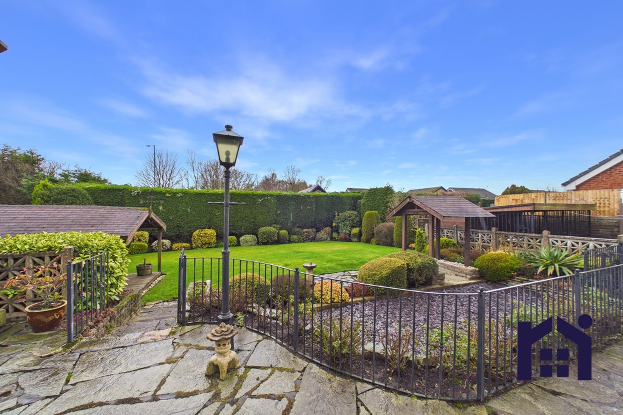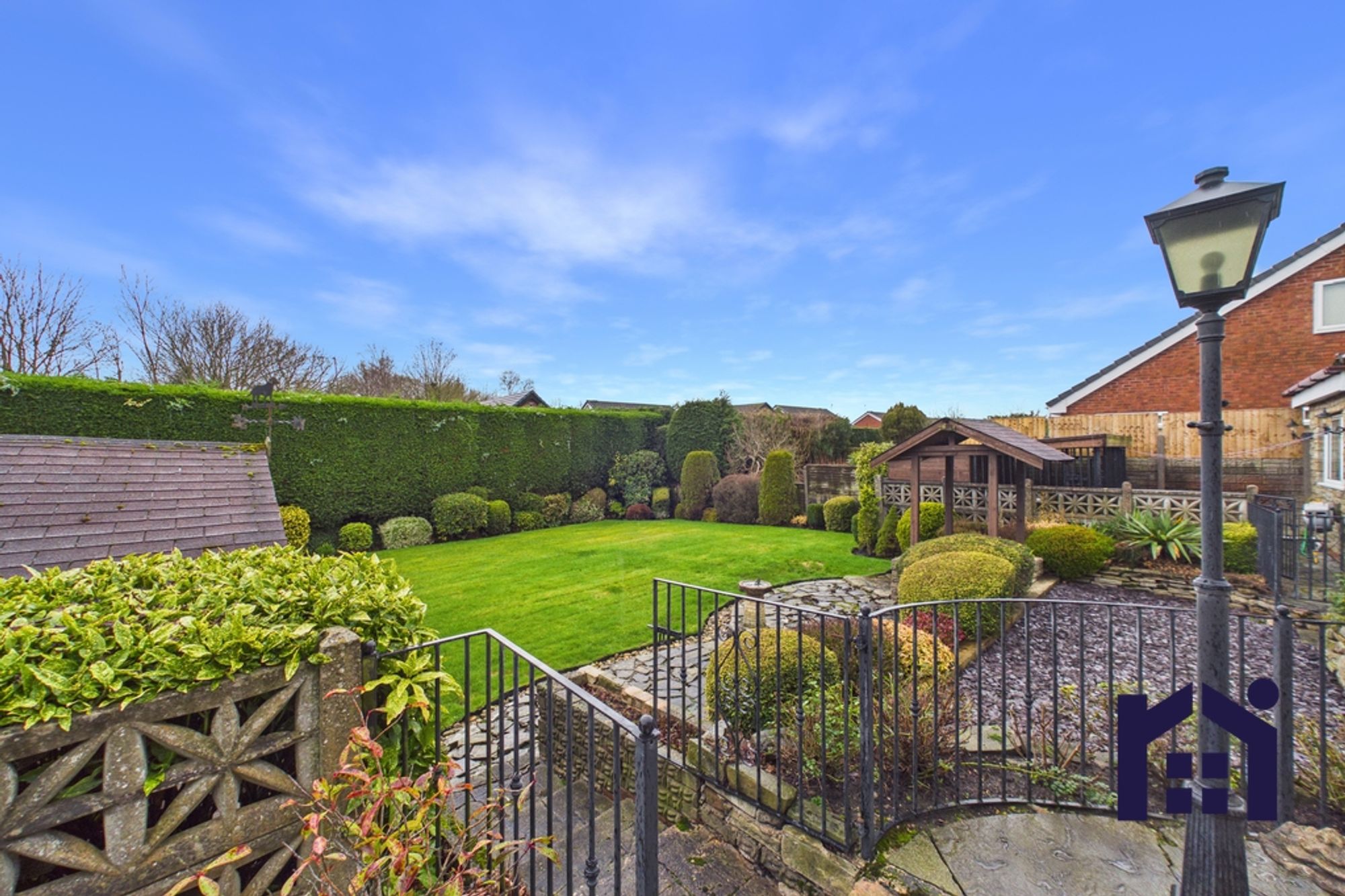 Step outside onto the sun terrace with iron railings, where steps lead down past crushed slate to the lower terrace and lawn, bordered by mature hedging and planting. Additional external features include a summer house and two large dog runs, completing this fantastic outdoor space.