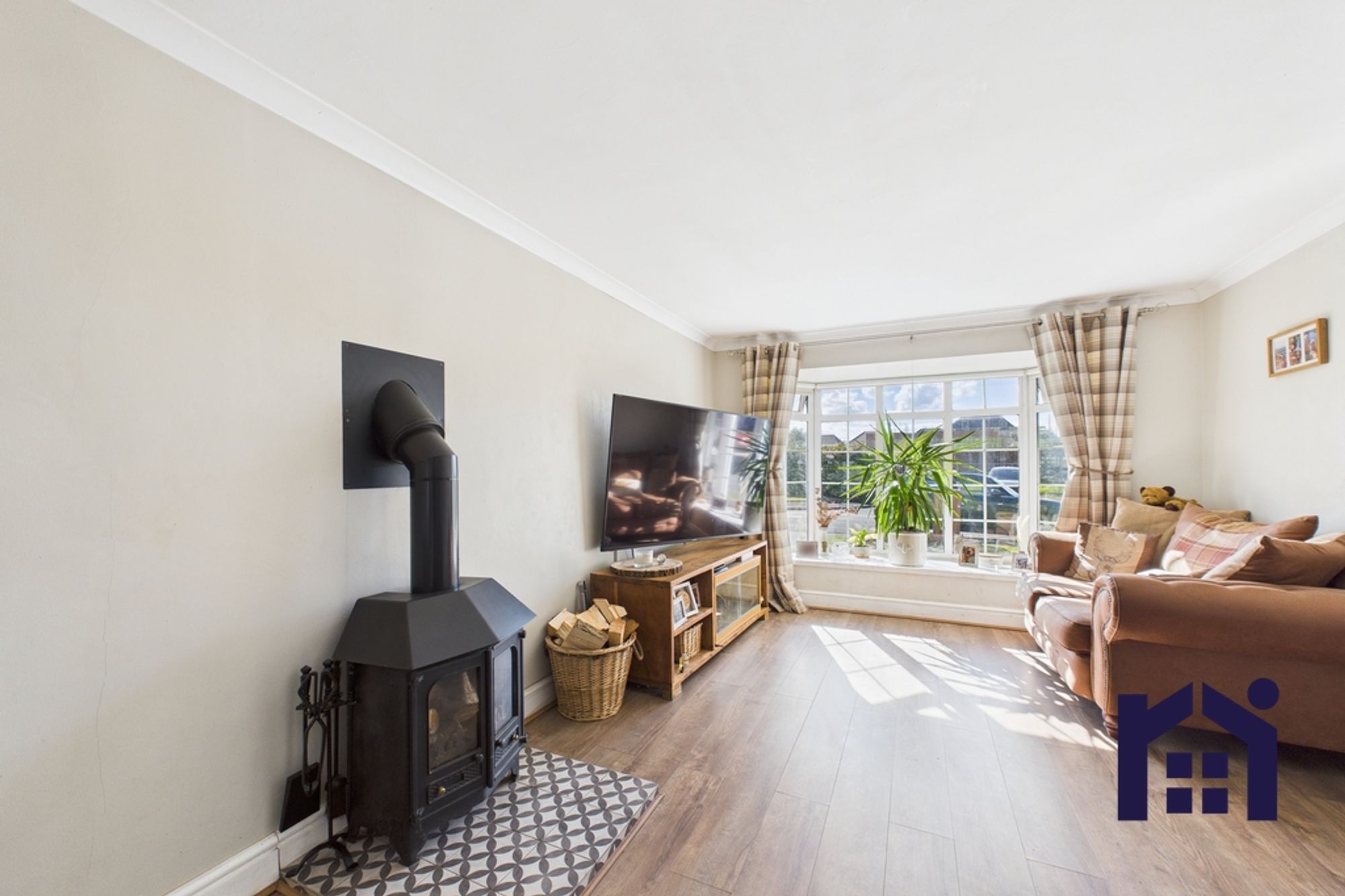 To the front, the tarmacadam driveway leads past the lawn to the extended garage and main entrance. Step into the welcoming hallway with cloakroom off comprising wc and wash hand basin. The living room benefits from plenty of natural light from the bay window and has wood burning stove to keep you nice and cosy.