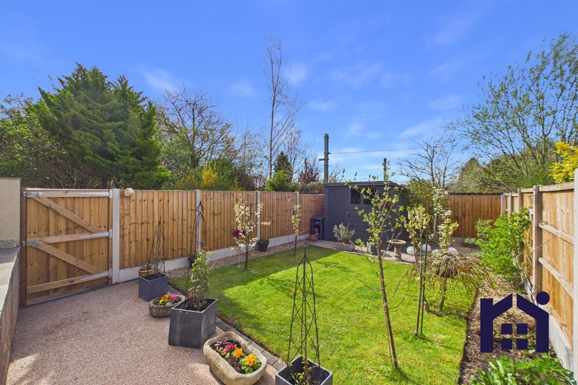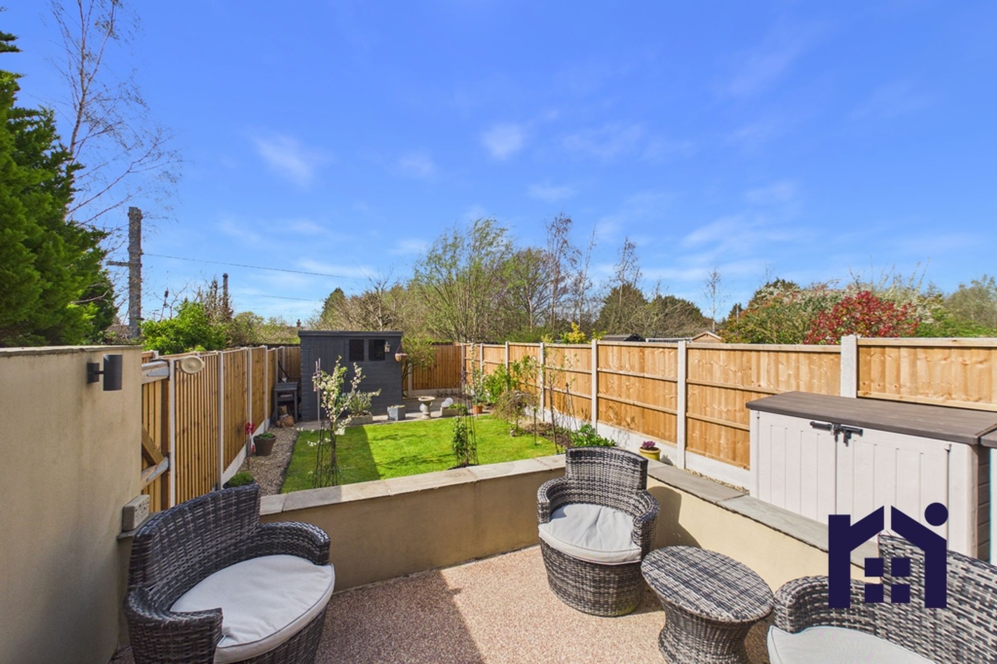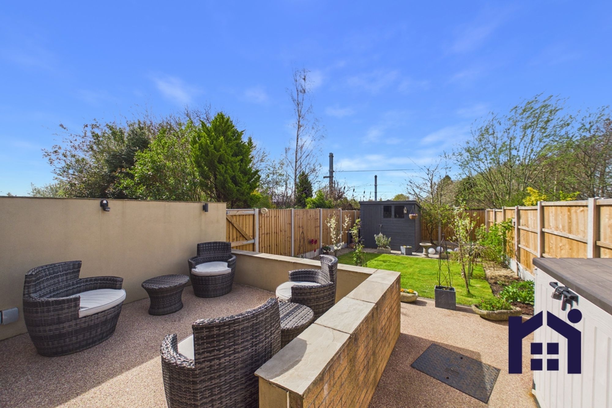 Externally, the property offers a low-maintenance garden with hard standing and an elevated seating area, ideal for outdoor entertaining. There is also side access for bins, along with a shed which will remain for storage.