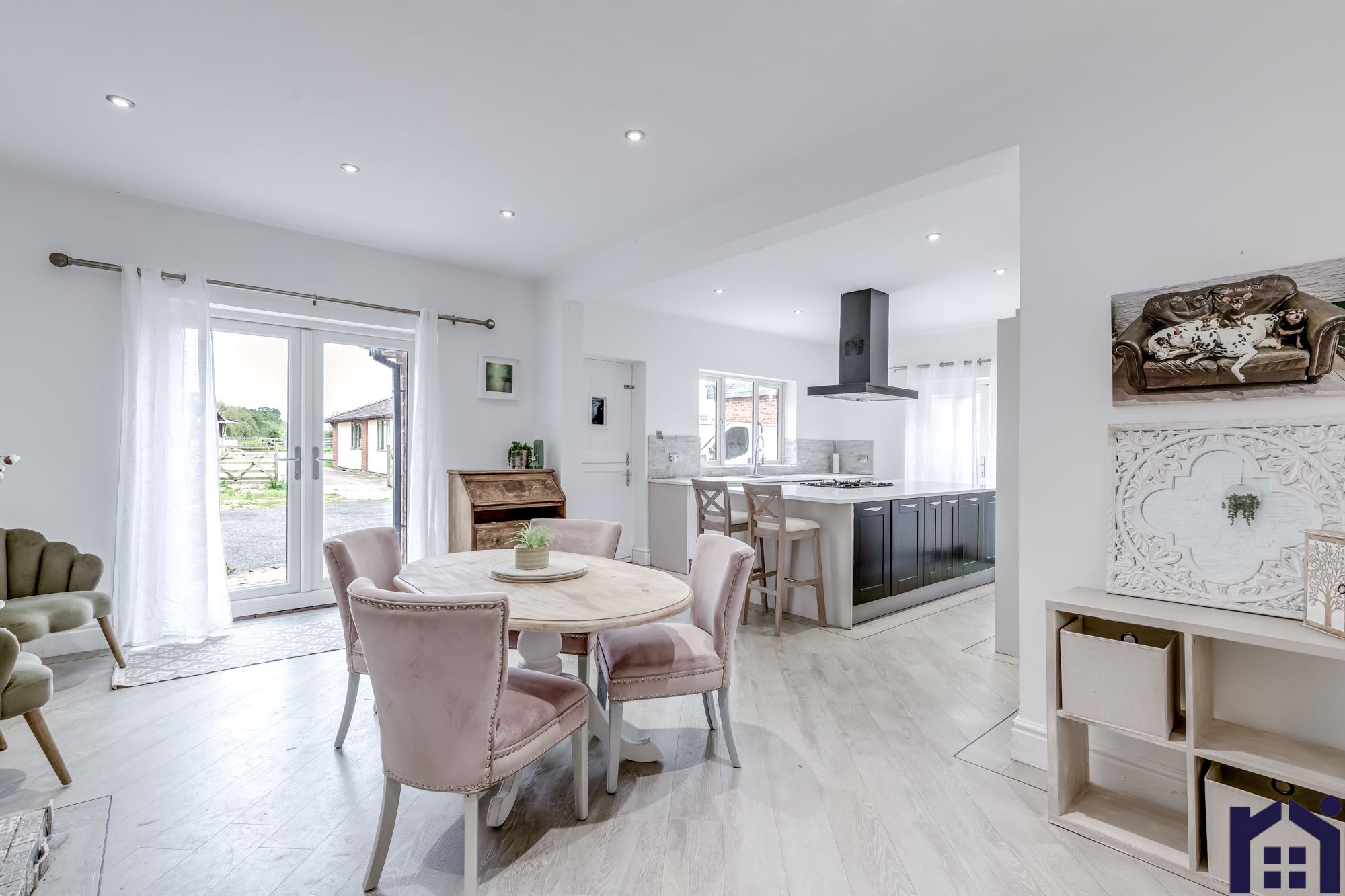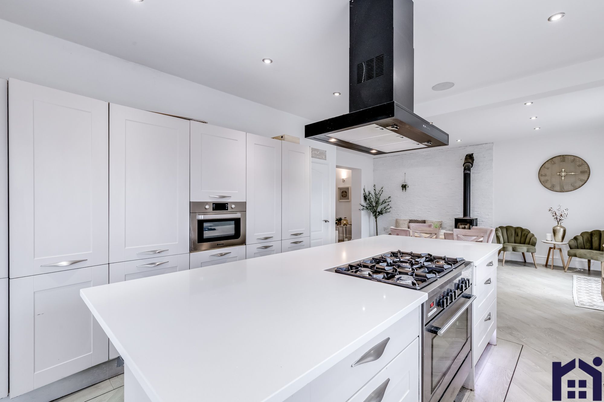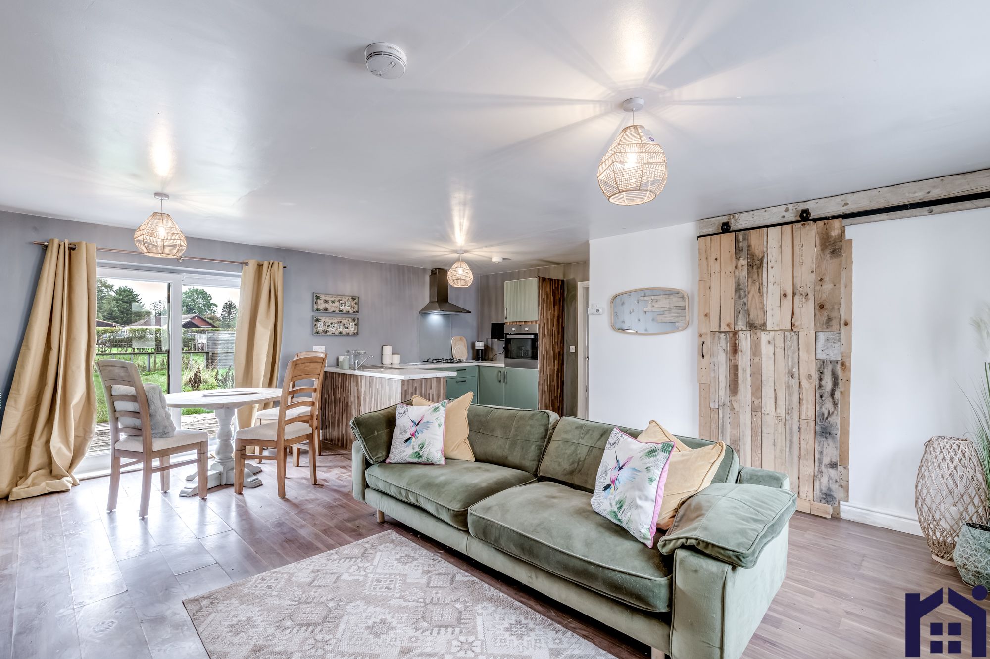 To the front, the driveway offers ample parking, including for a caravan or motorhome, and leads to the yard to the rear and to the main entrance. Step into the hallway and from there to the living room with Karndean flooring. which flows through much of the ground floor, and benefits from wood burning stove. The open plan space continues to the dining area, also with wood burning stove and patio doors to the rear, and into the kitchen comprising a range of wall and base units with central island and quartz work surfaces, range cooker, refrigerator & freezer, dishwasher and microwave.