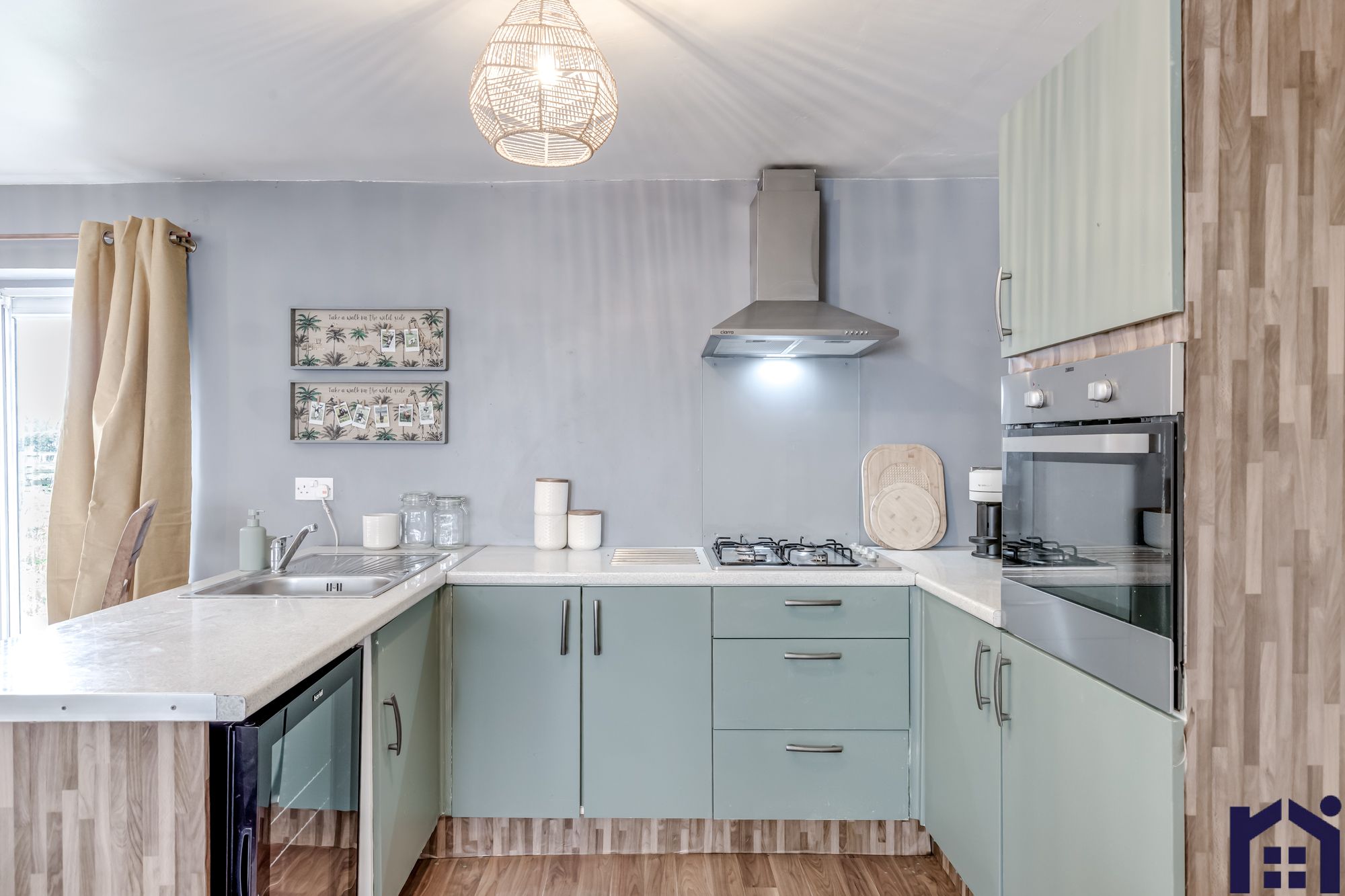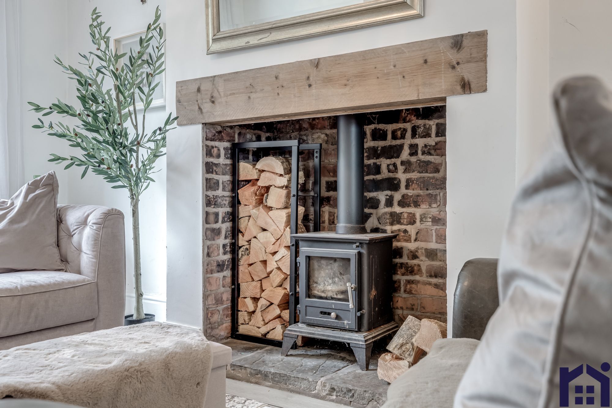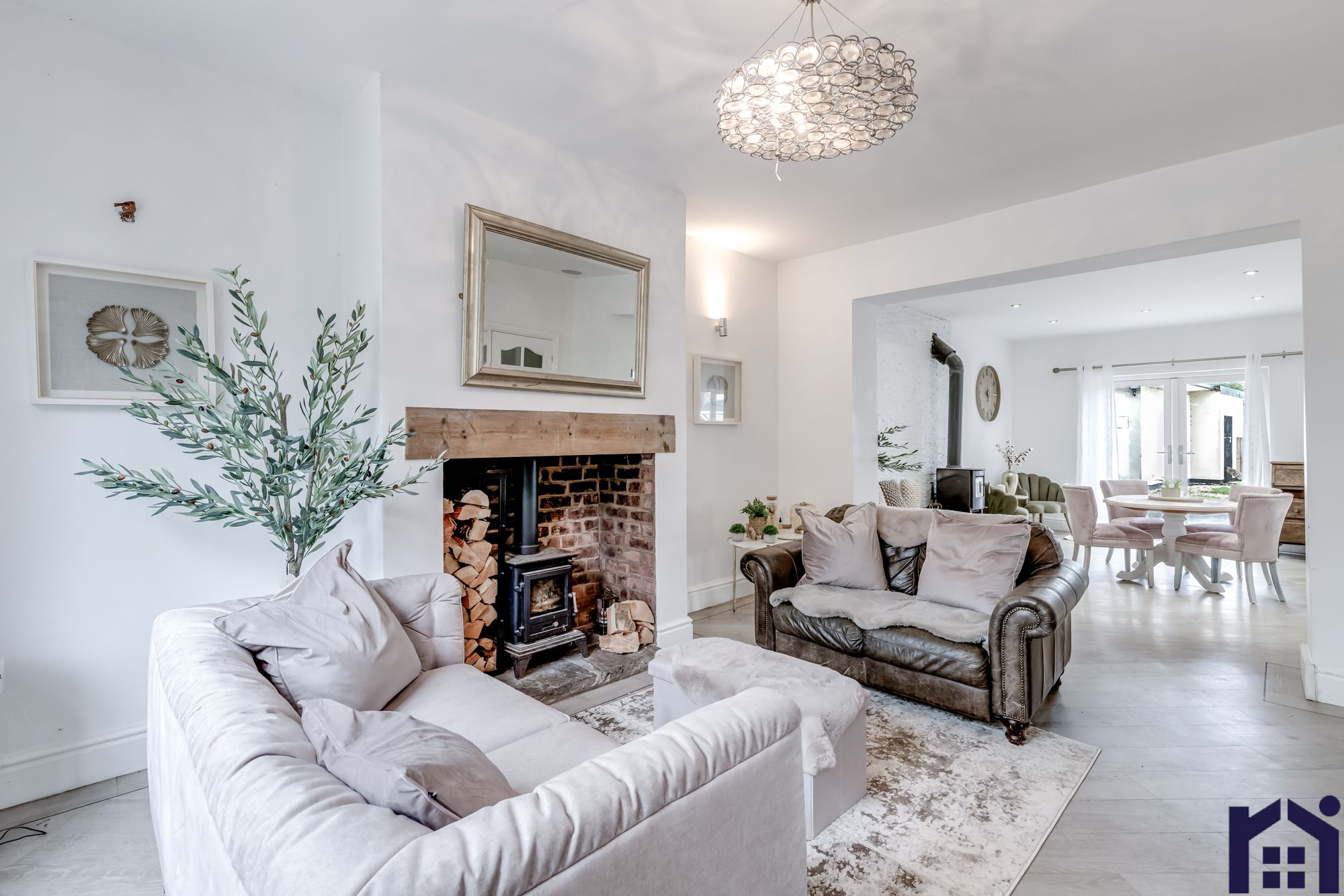 To the front, the driveway offers ample parking, including for a caravan or motorhome, and leads to the yard to the rear and to the main entrance. Step into the hallway and from there to the living room with Karndean flooring. which flows through much of the ground floor, and benefits from wood burning stove. The open plan space continues to the dining area, also with wood burning stove and patio doors to the rear, and into the kitchen comprising a range of wall and base units with central island and quartz work surfaces, range cooker, refrigerator & freezer, dishwasher and microwave.