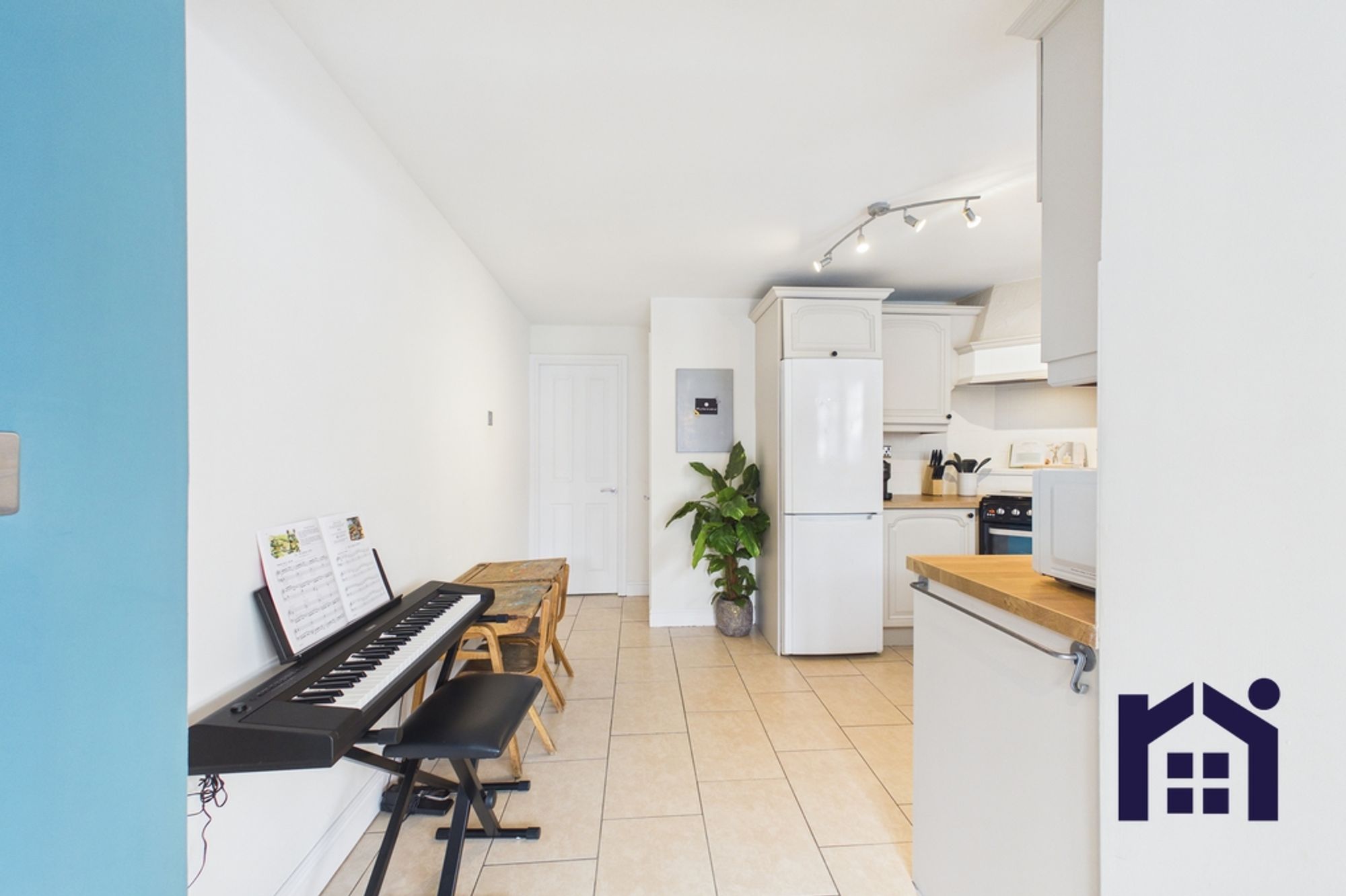 To the rear, the neutral kitchen offers fantastic under-stair storage, space for a fridge/freezer, oven and washing machine, extractor hood and ample cupboard space. This flows into a sun room currently used as a dining area, enjoying views over the beautiful garden.