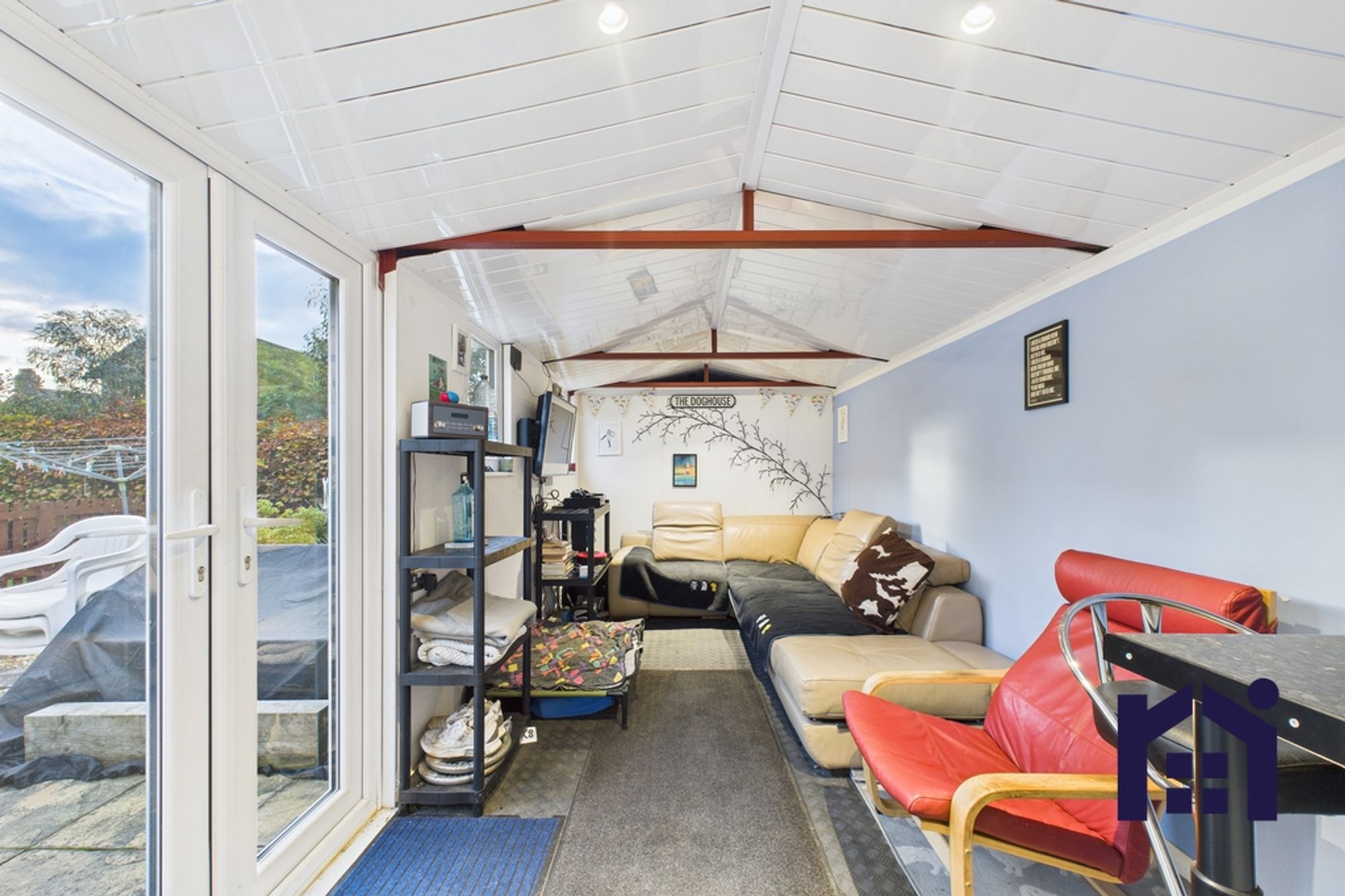 Outside, the property continues to impress with a large, low-maintenance rear garden featuring a lazy lawn, mature beech hedging, and a private sun terrace with raised beds. At the end of the garden stands a superb detached garden studio with power, lighting, and plumbing — perfect for use as a home office, gym, or creative workspace, and ideal for those wishing to run a business from home.