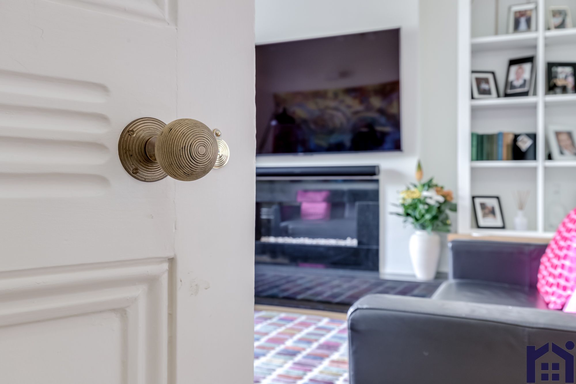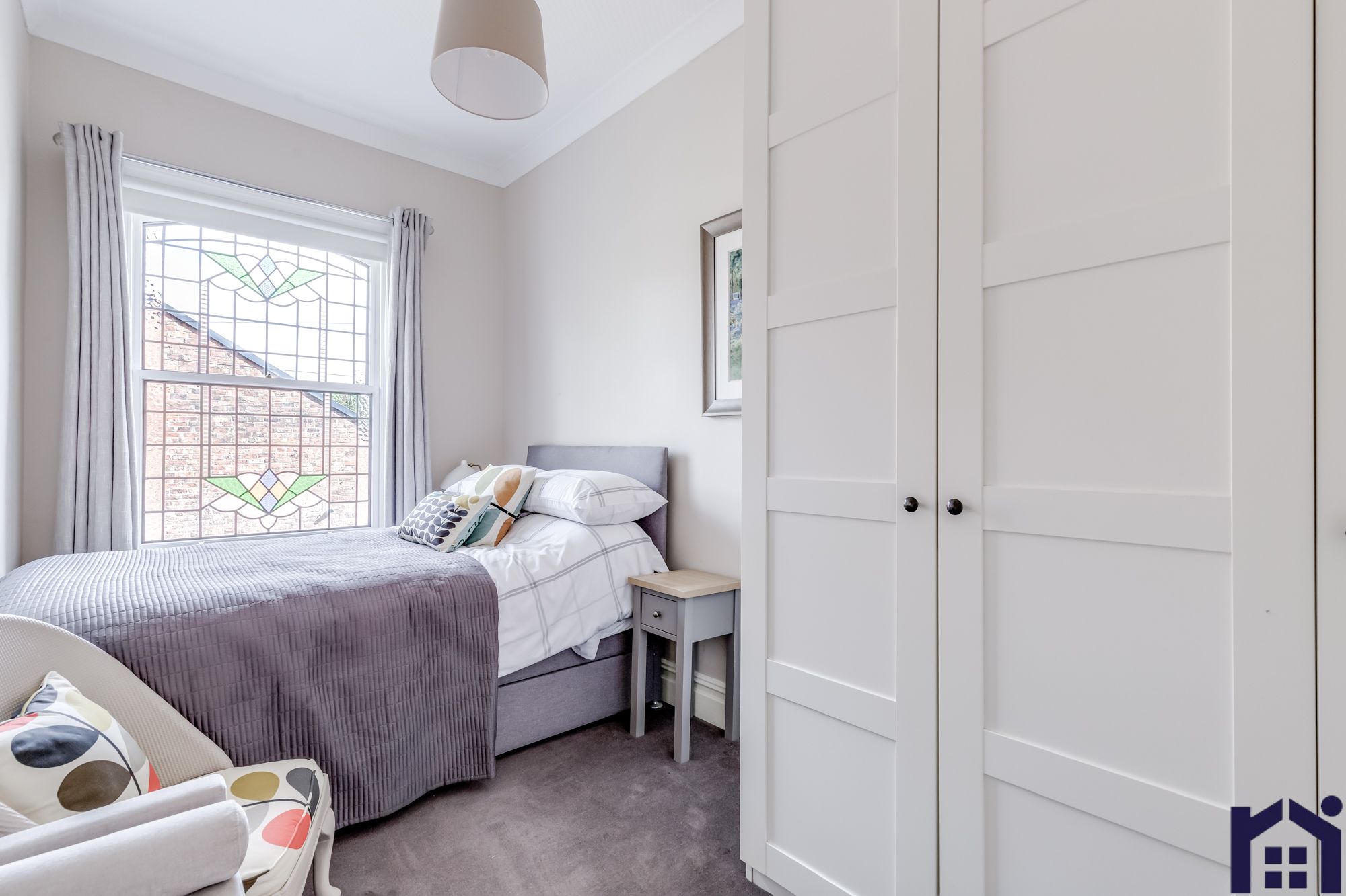 To the right is the formal period sitting room with open fire in stone hearth whilst to the left is the living room with a more modern twist, stained glass sash windows and remote controlled inset electric fire.
