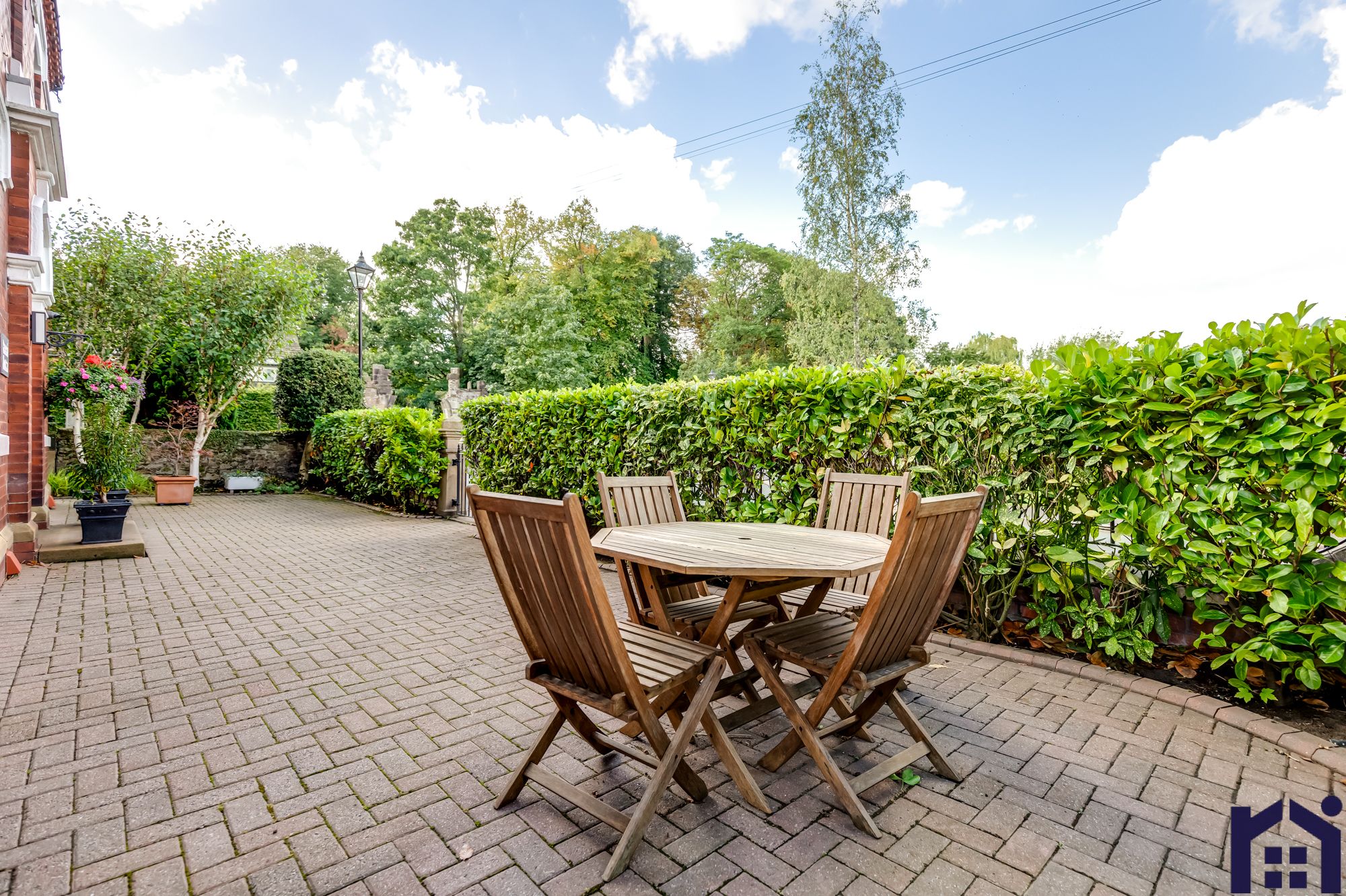Mature hedging screens the block-paved front garden with private seating area leading to the imposing main entrance. Step into the vestibule and from there to the welcoming hallway with travertine flooring and Lincrusta wall coverings.