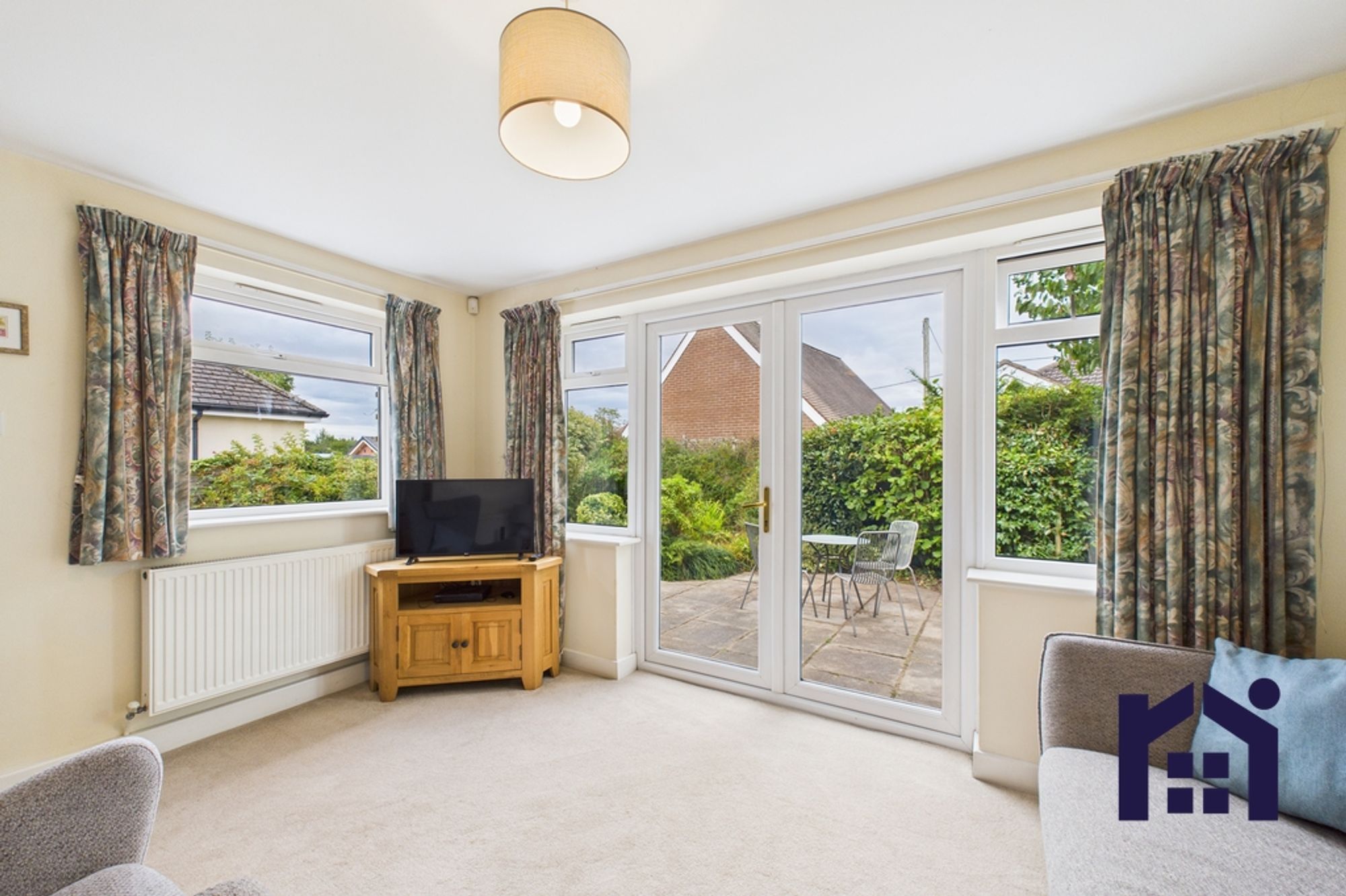 To the rear, the delightful living room has patio doors overlooking the garden.