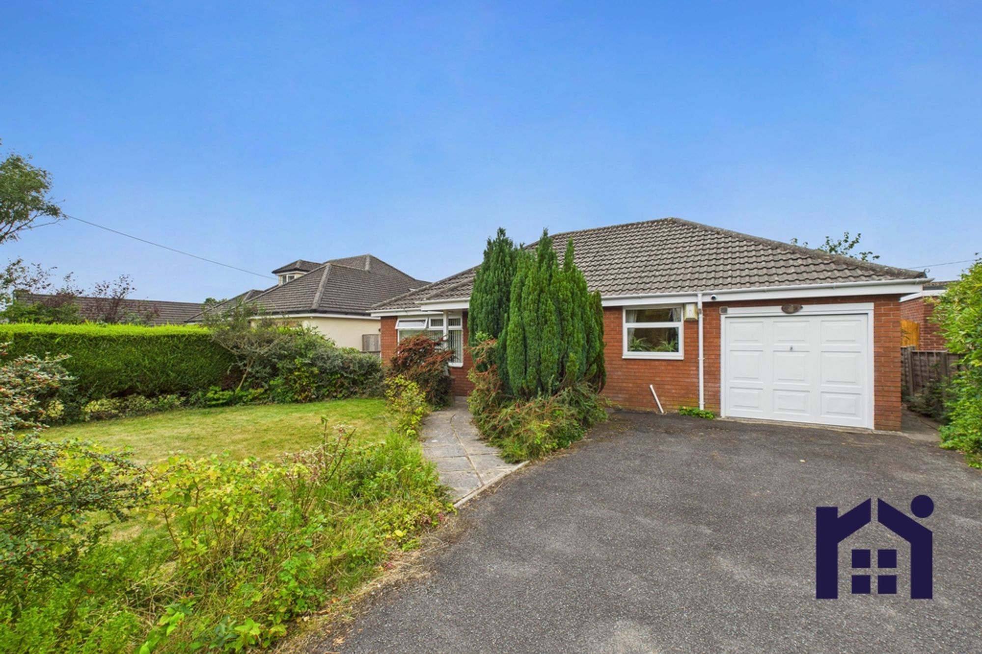 To the front, the tarmacadam driveway can accommodate two vehicles and leads past the lawn surrounded by mature hedging, to the garage and main entrance with courtesy porch.