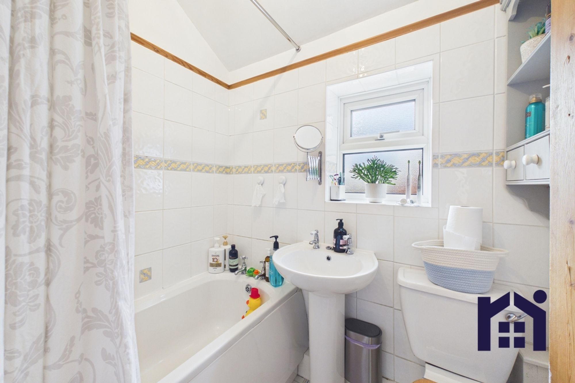 The family bathroom comprises a bath with overhead shower, wash basin, and WC.
