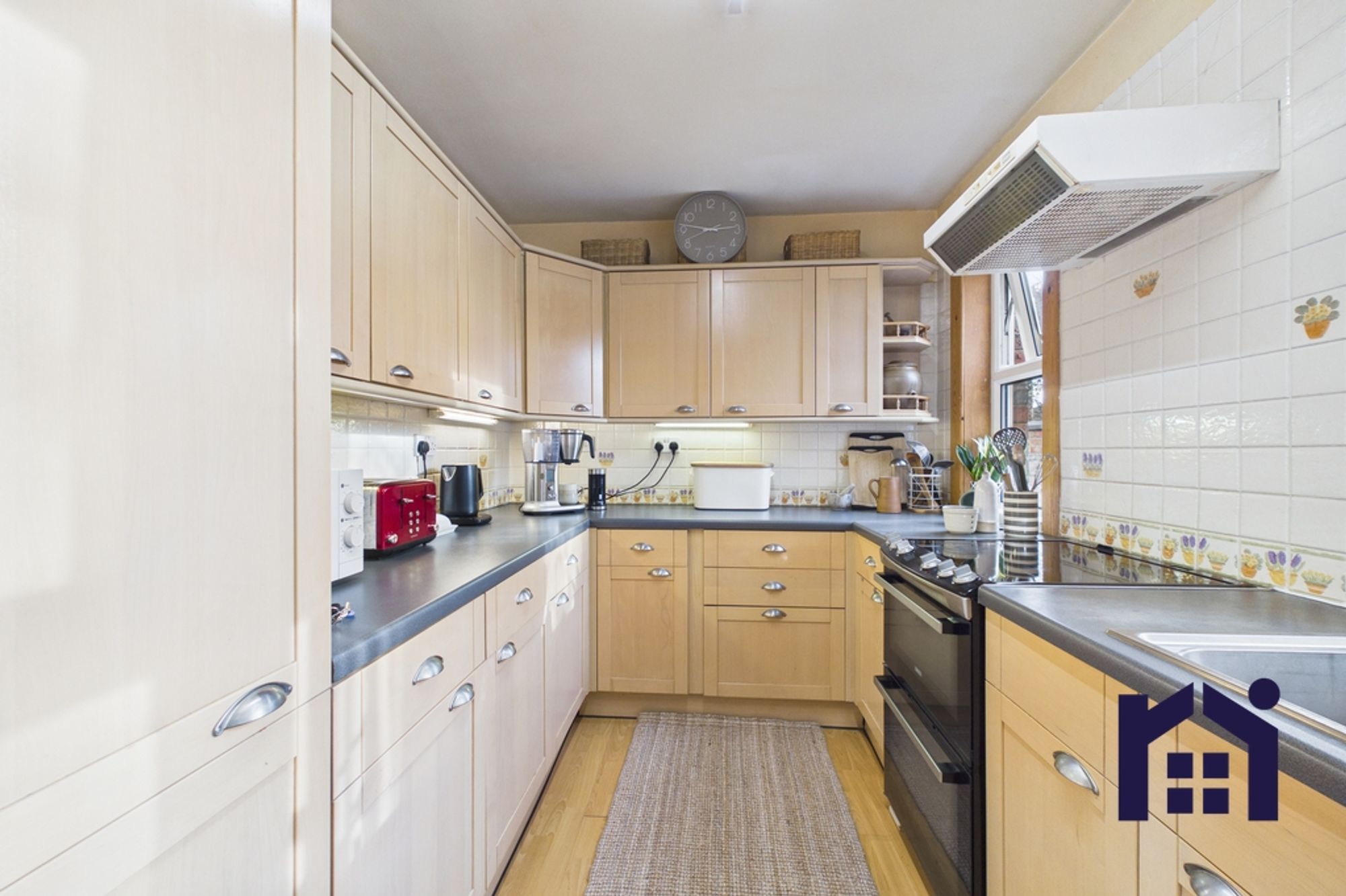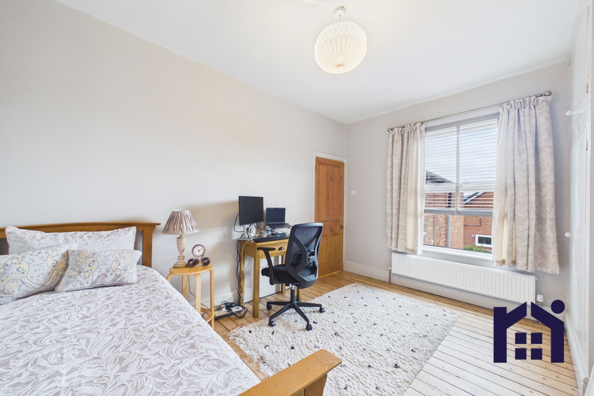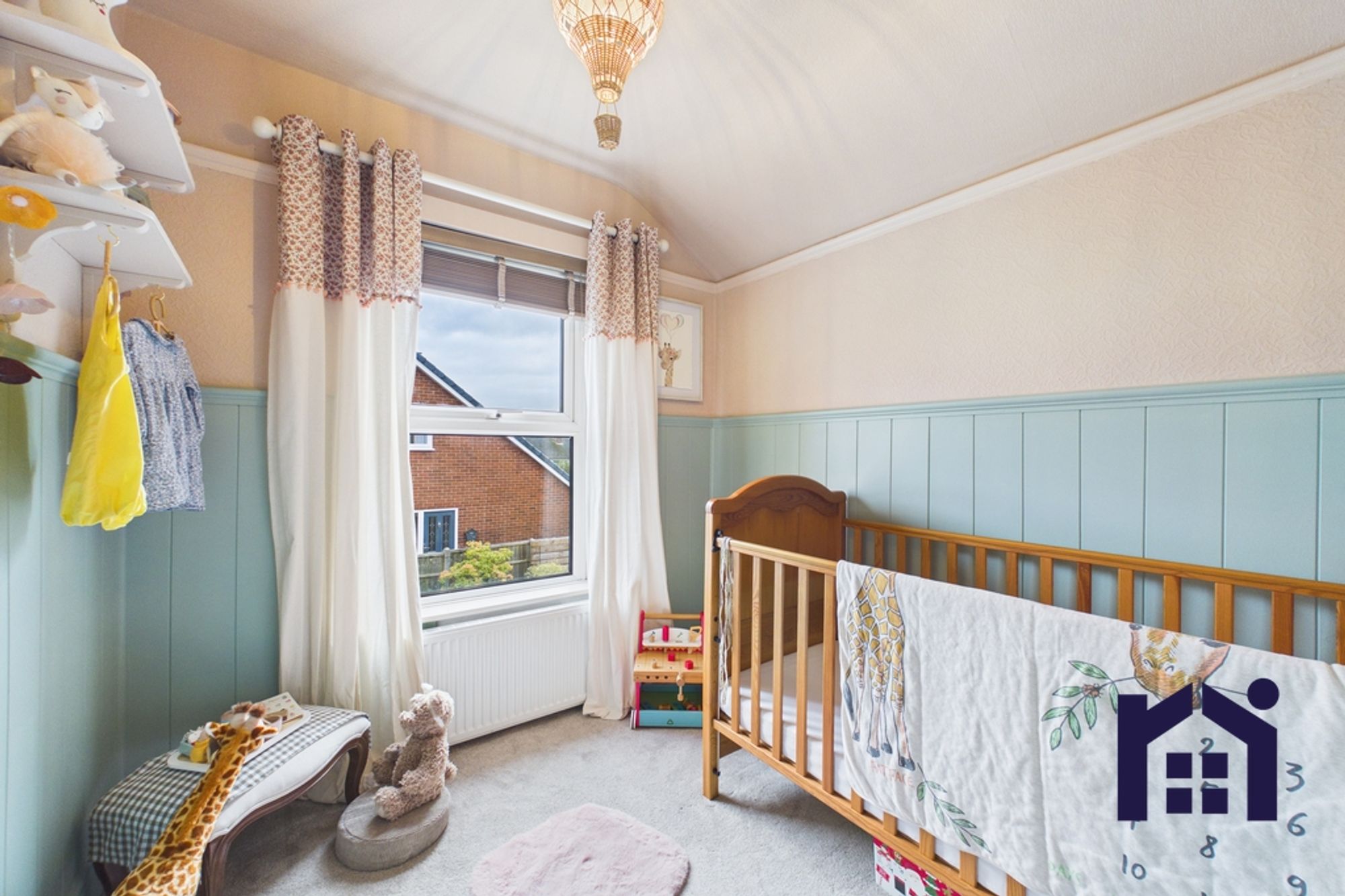 To the first floor, the landing provides loft access. The largest bedroom is a generous double with two large windows allowing for excellent natural light, along with ample wardrobes which will be left in situ. The second double bedroom enjoys views over the rear garden and features two built-in storage cupboards. The third bedroom, also a double, is currently arranged as a loving nursery.