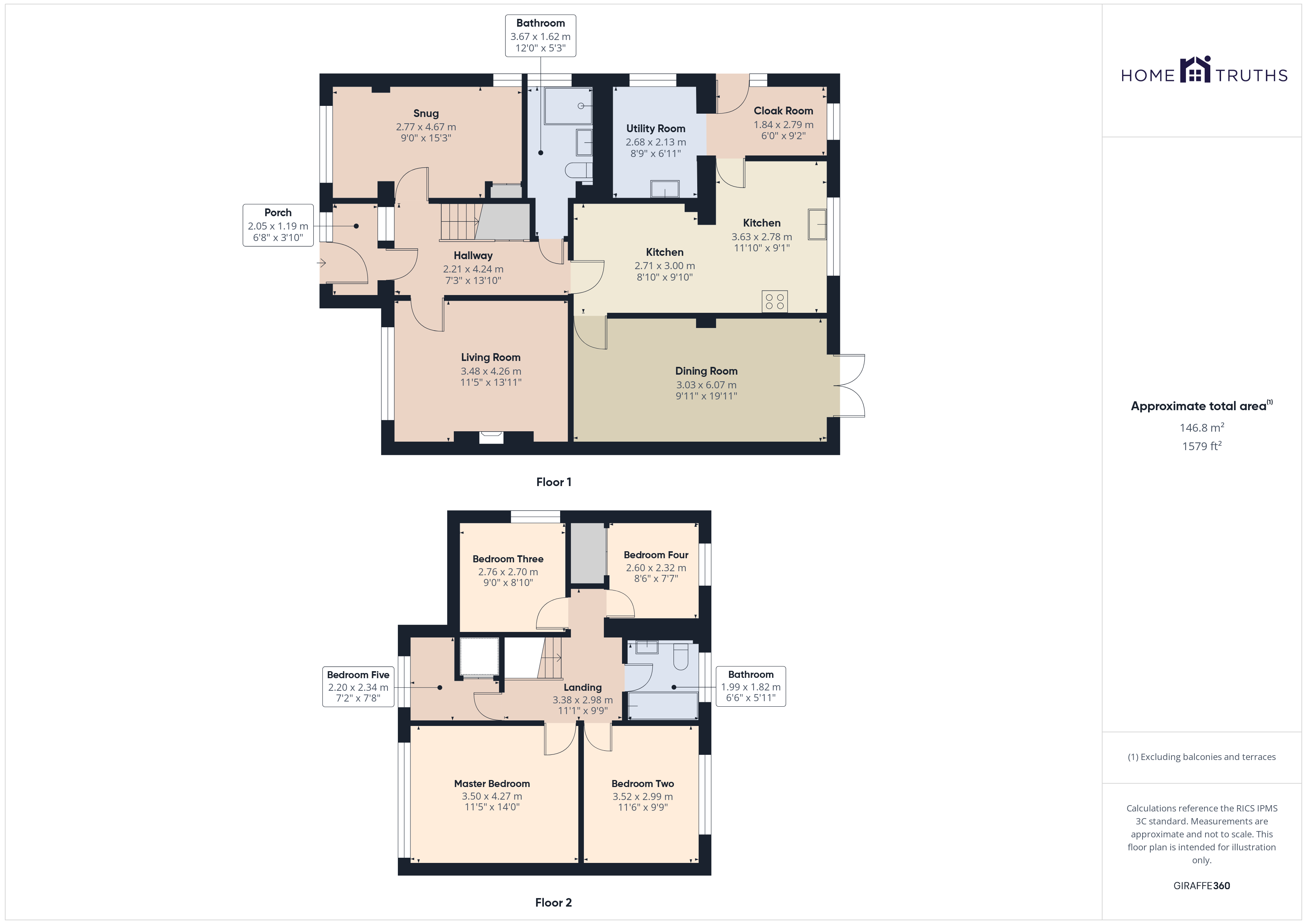 Back inside, stairs lead to the first floor landing with three double bedrooms, a comfortable single and the fifth bedroom currently used as a home office. The family bathroom comprises bath with screen and electric shower over, wc, wash hand basin, ladder heated towel rail and fully tiled elevations and flooring.
