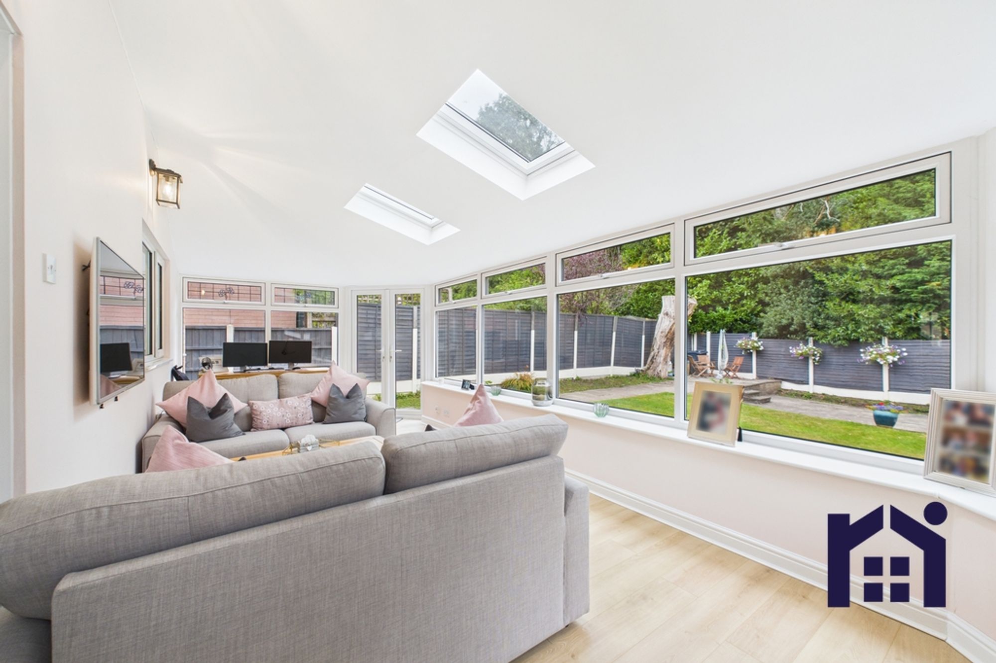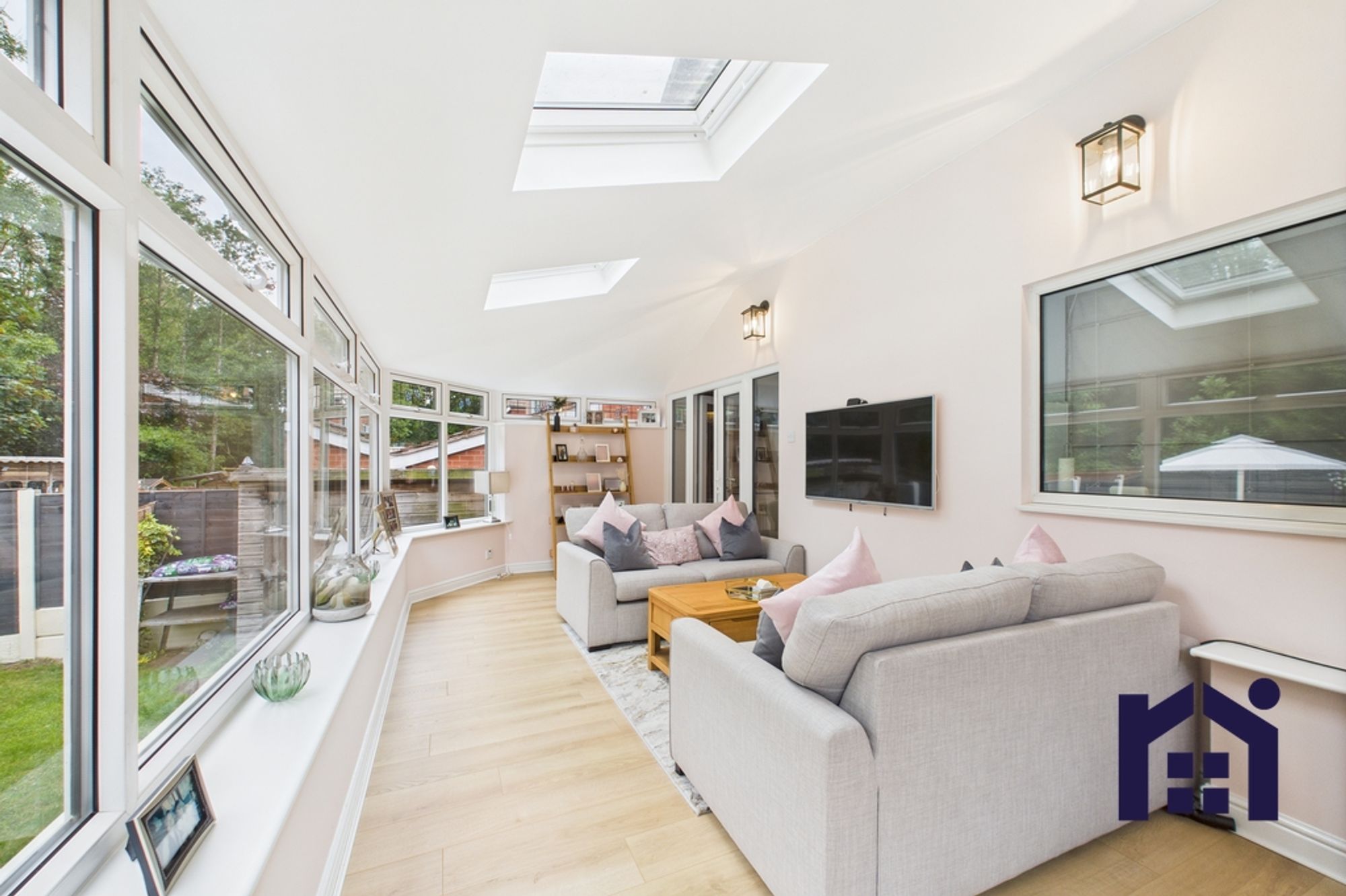 The block paviour driveway leads past the lawn to the main entrance. Step into the welcoming hallway and from there to the living room with inset wall mounted remote controlled gas fire. Leading off is the dining room which in turn has patio doors to the delightfully large sun room overlooking the garden.