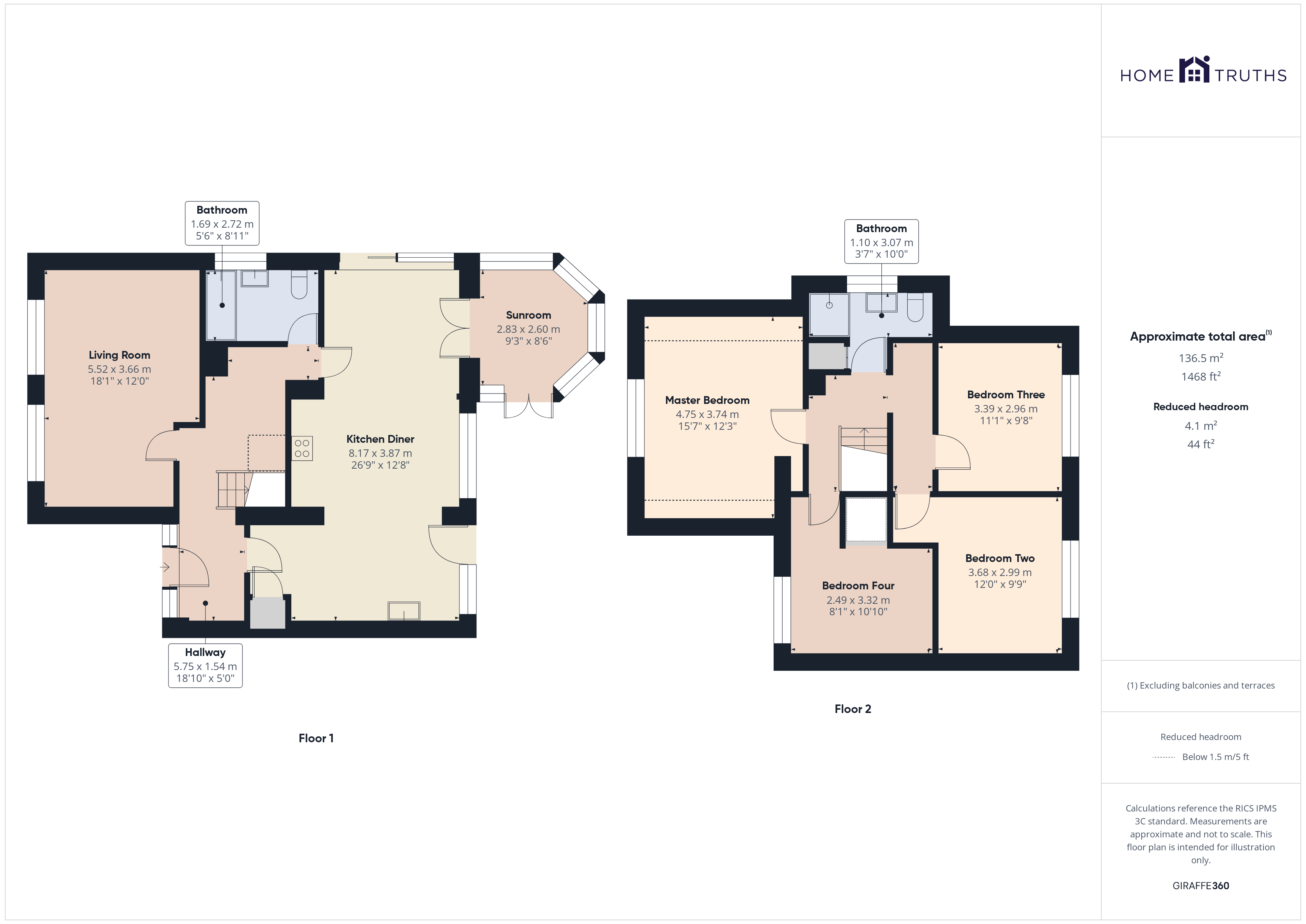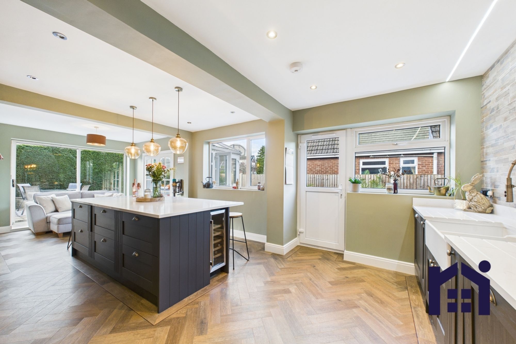 The property features four generous double bedrooms, providing ample space for family life or guest accommodation. A welcoming entrance hallway with Amtico flooring sets the tone for the home’s elegant interior, leading through to a superb open-plan dining kitchen— the true heart of the home.