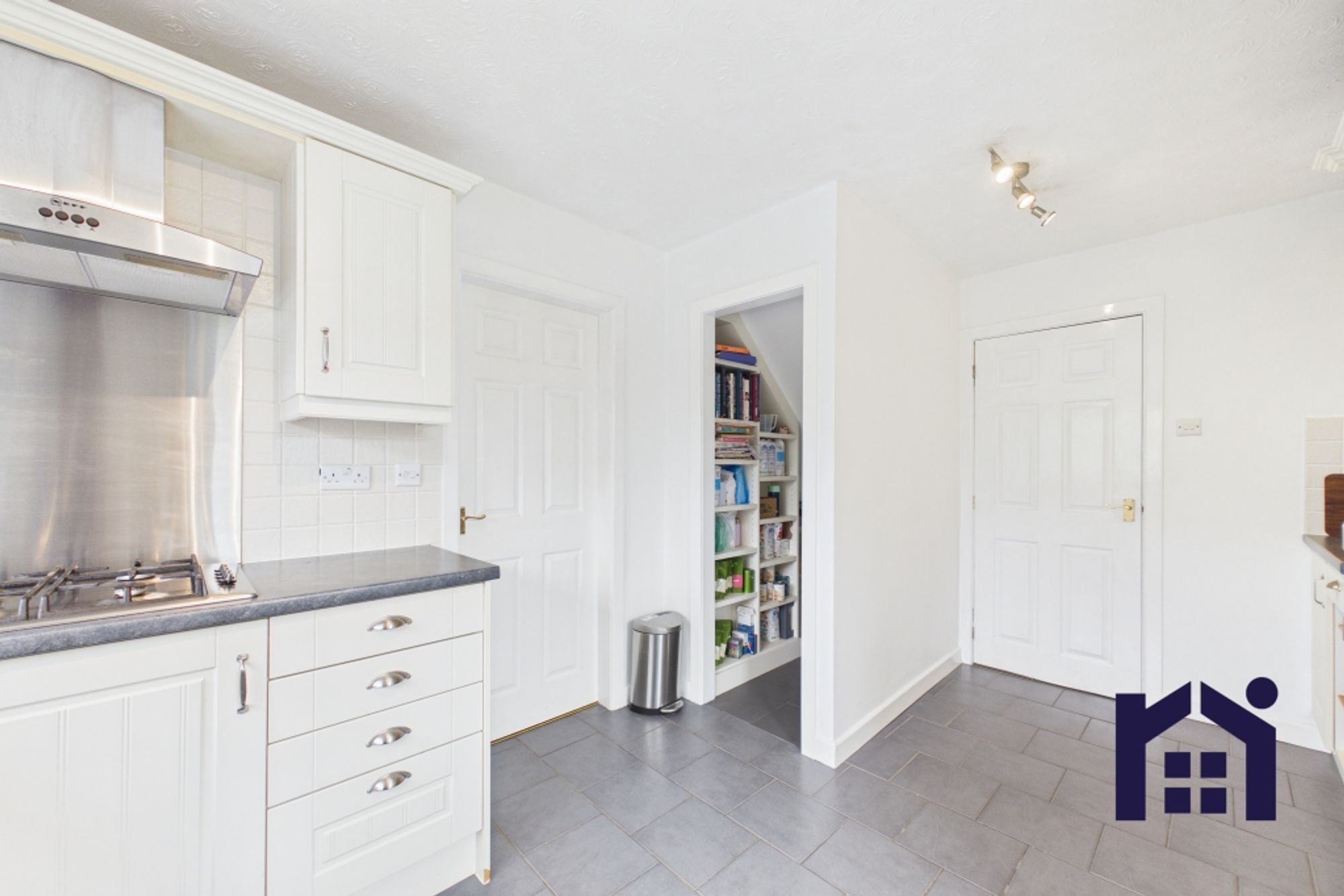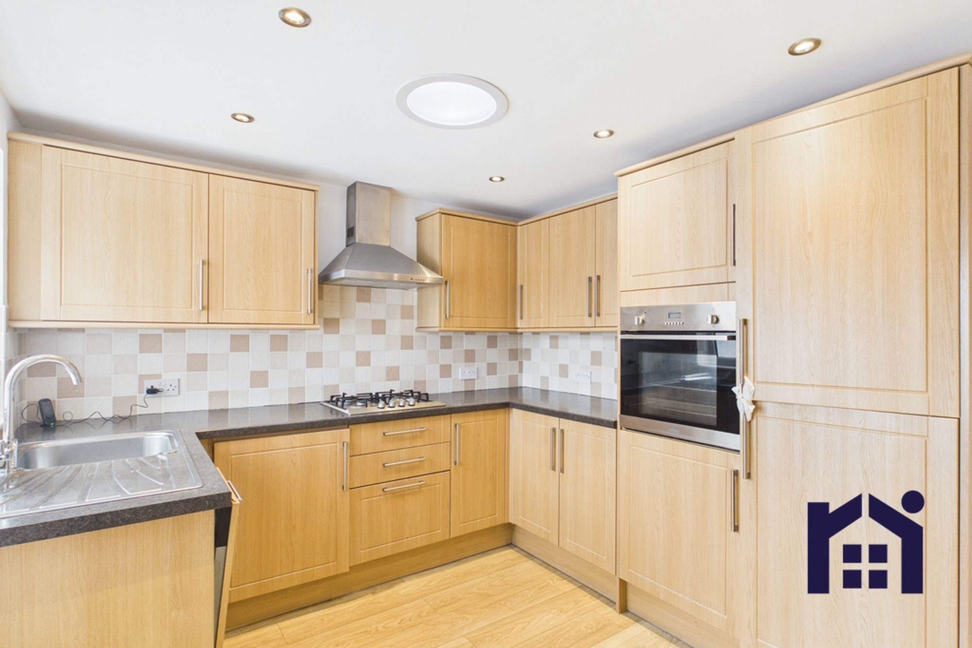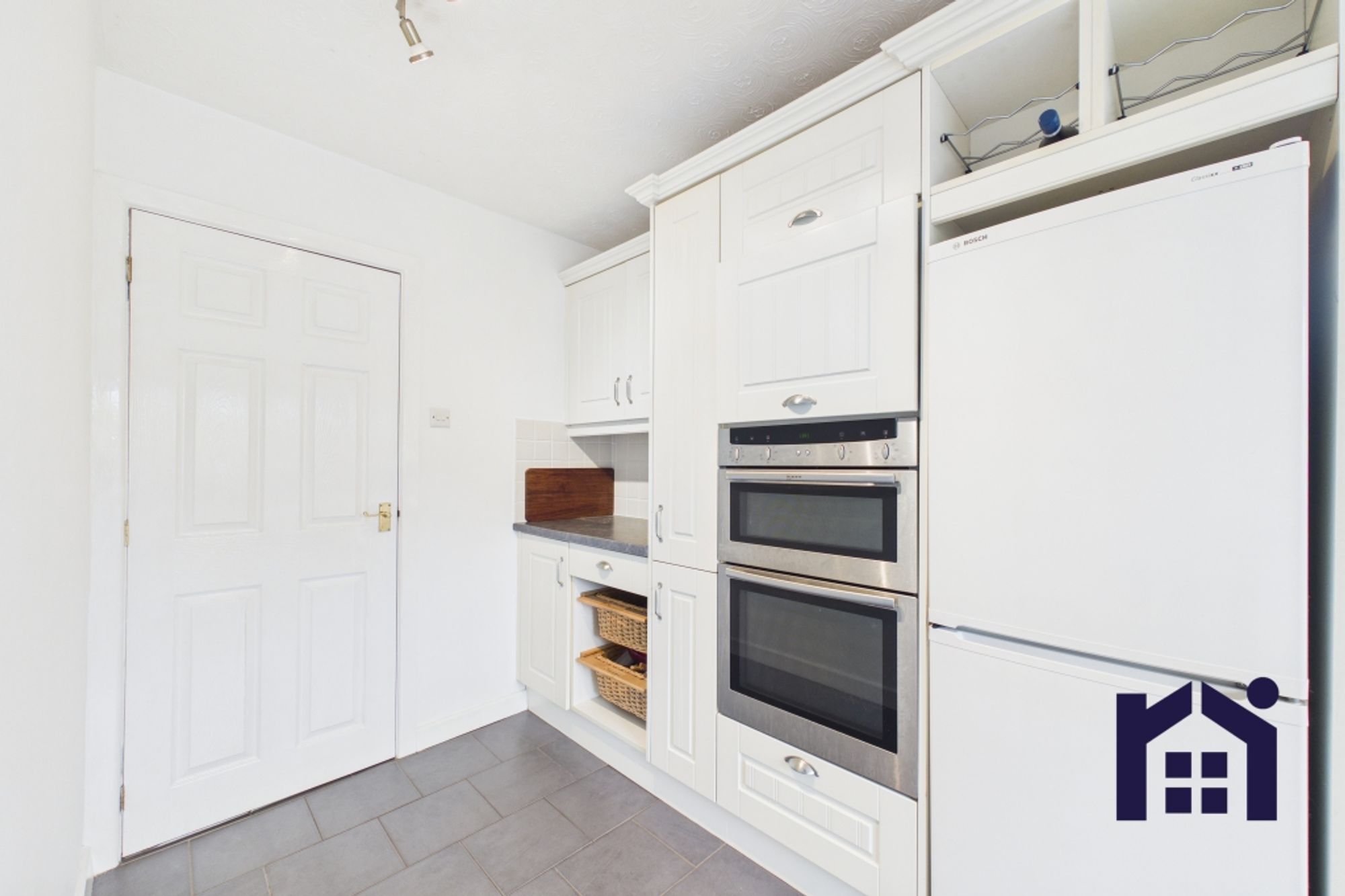 To the rear, the kitchen comprises a range of wall and base units with gas hob, electric oven and grill, along with space, power and plumbing for additional appliances.