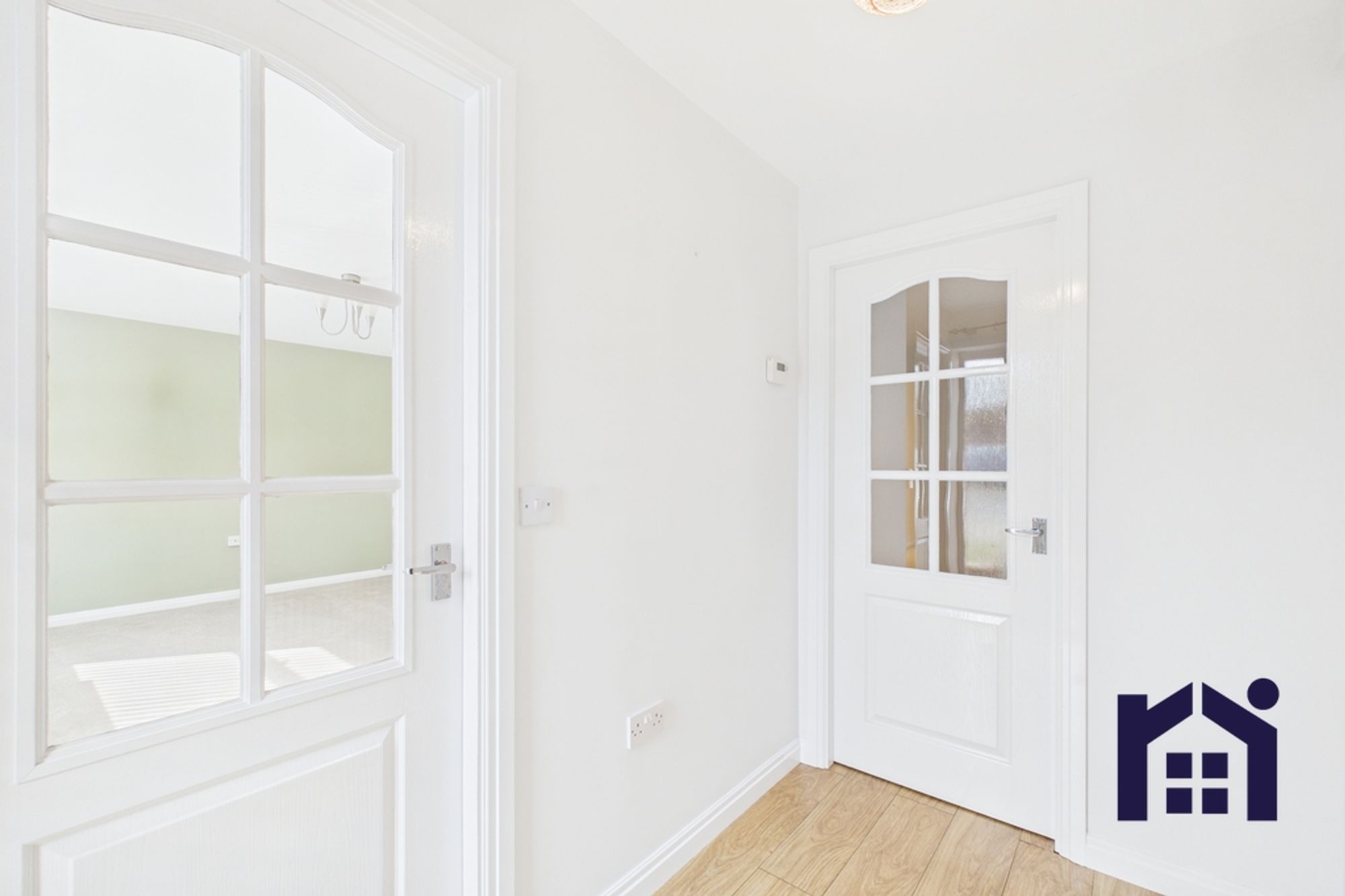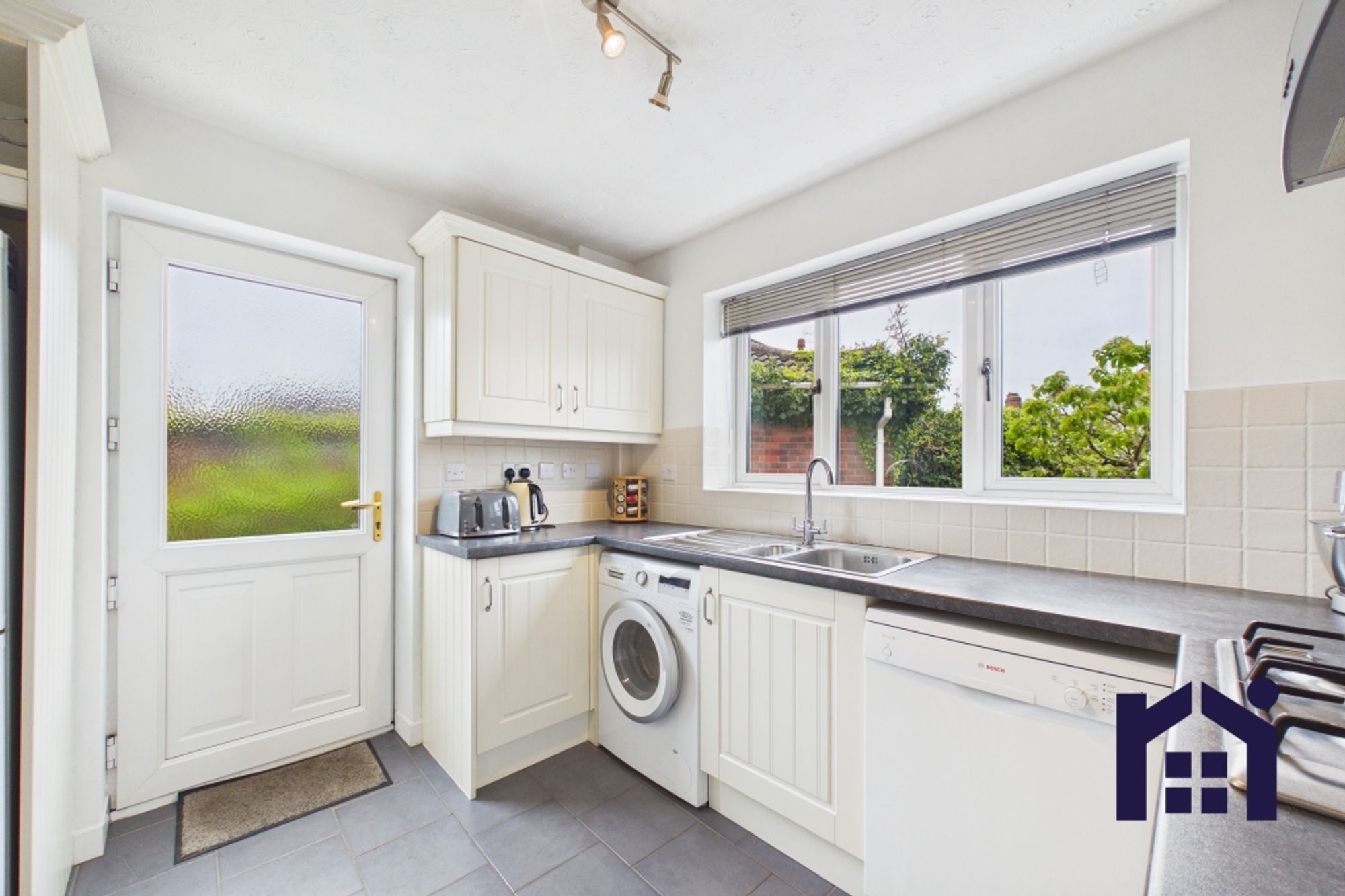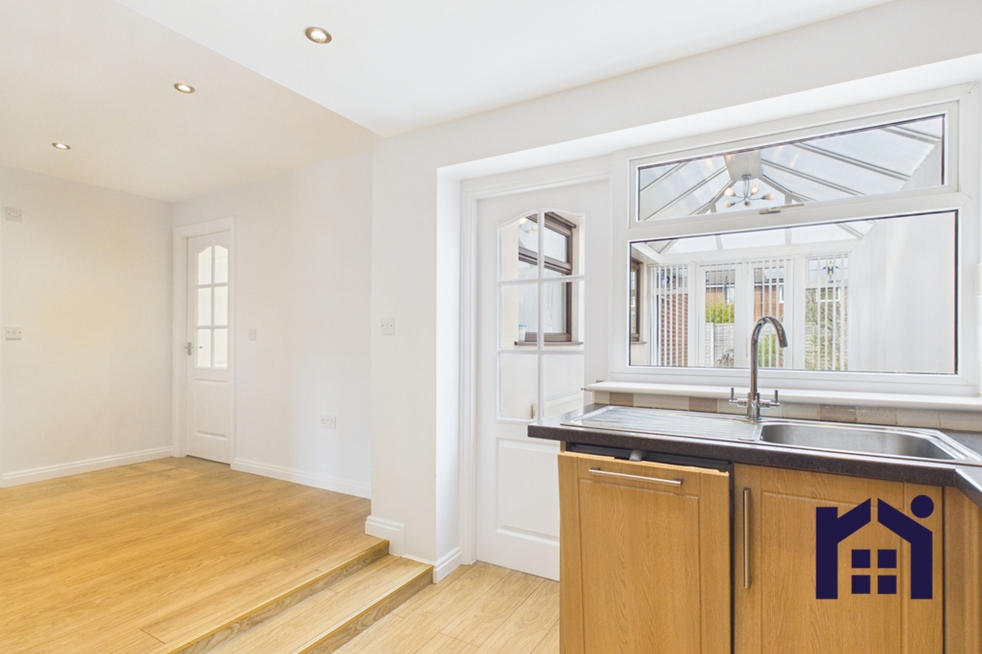 To the rear, the kitchen comprises a range of wall and base units with gas hob, electric oven and grill, along with space, power and plumbing for additional appliances.