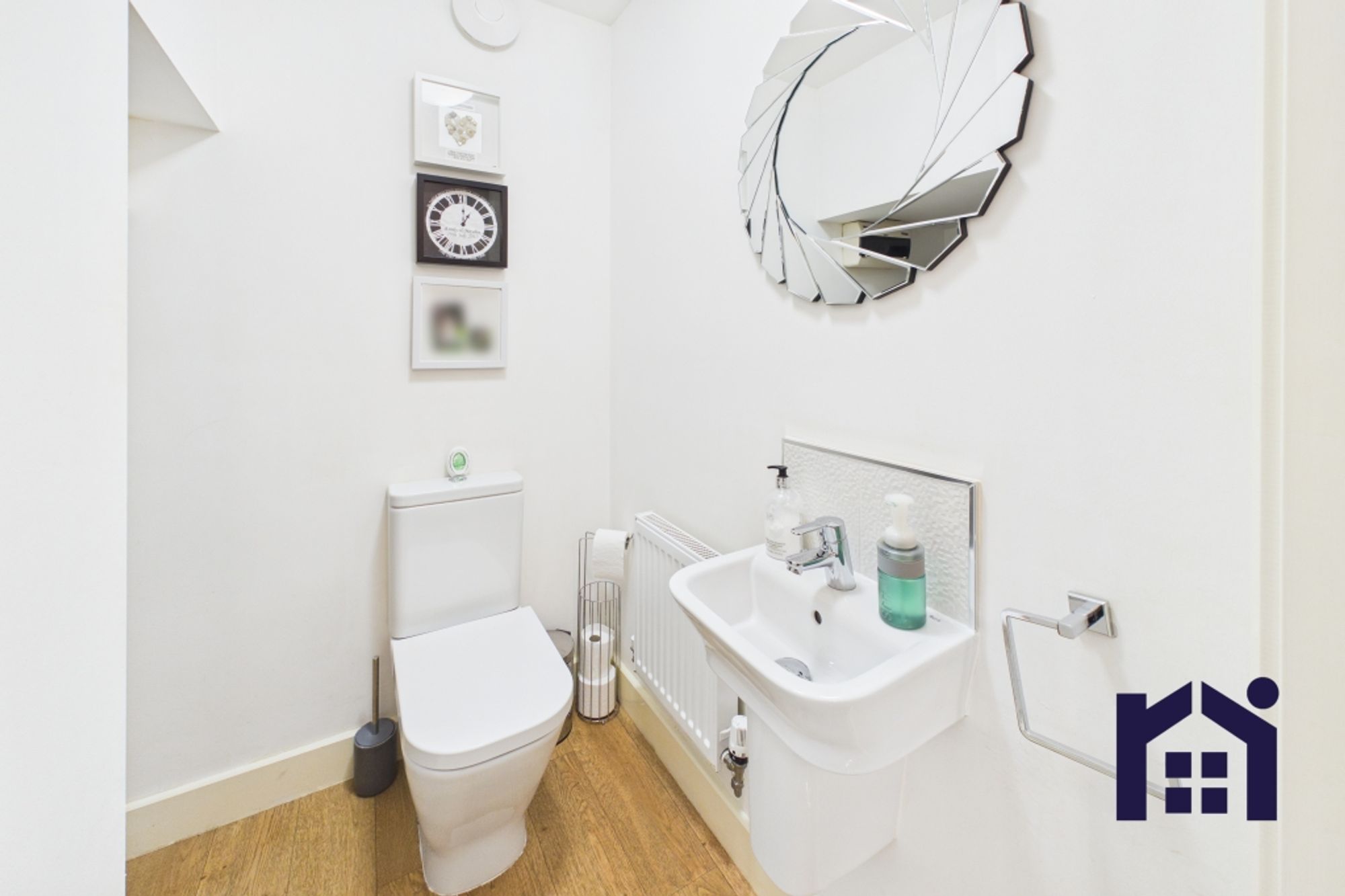 The property sits behind a large front garden with lawn, mature hedging and established planting including rose, camellia and ceanothus, with a driveway and garage adjacent. Step into the entrance hallway, with cloakroom off comprising wc and wash hand basin.