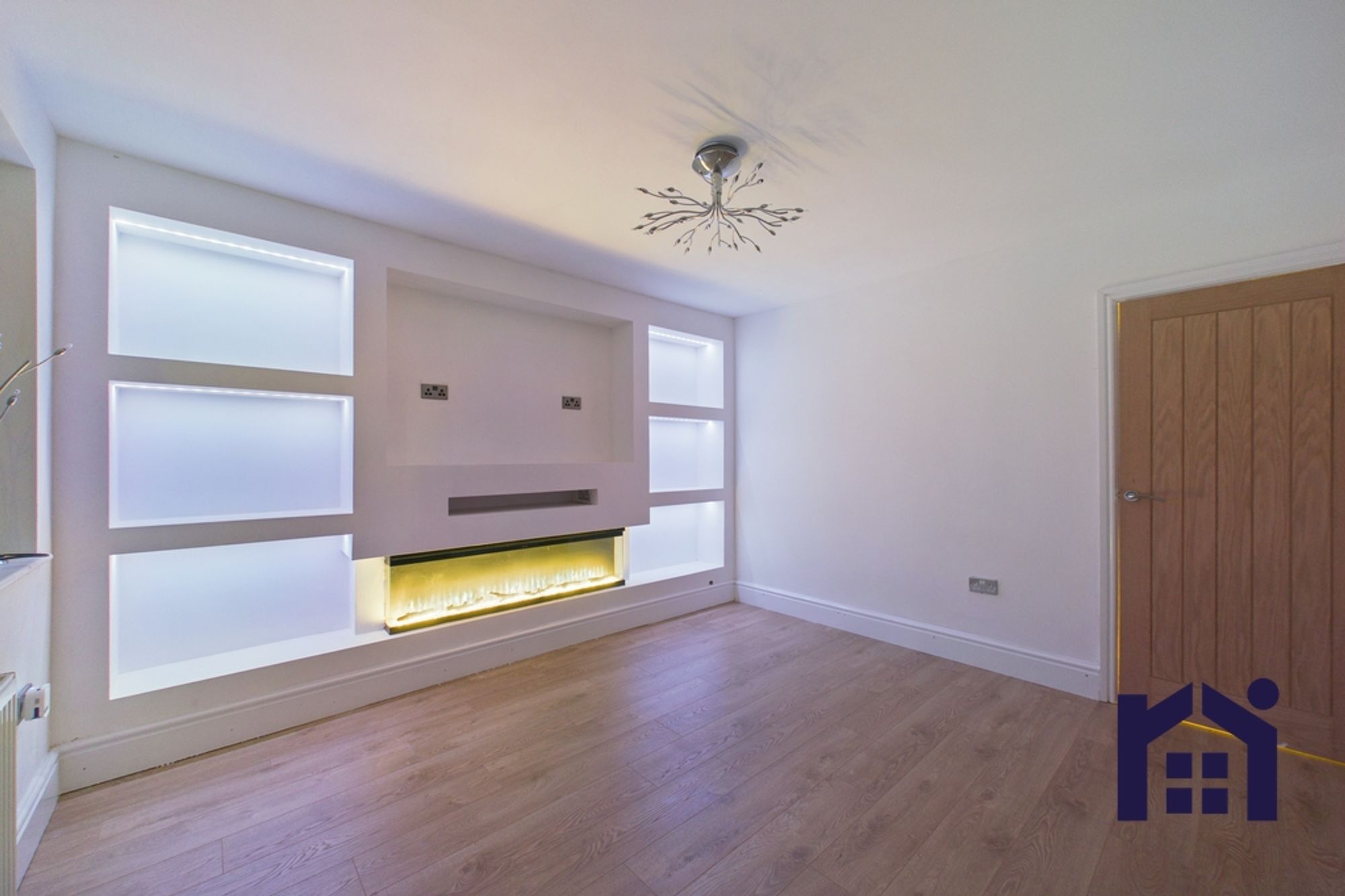 Inside, the living room is finished with neutral laminate flooring and benefits from a bespoke media wall incorporating multiple power sockets for seamless connectivity. A window to the front elevation allows for plenty of natural light, enhancing the clean, modern aesthetic.