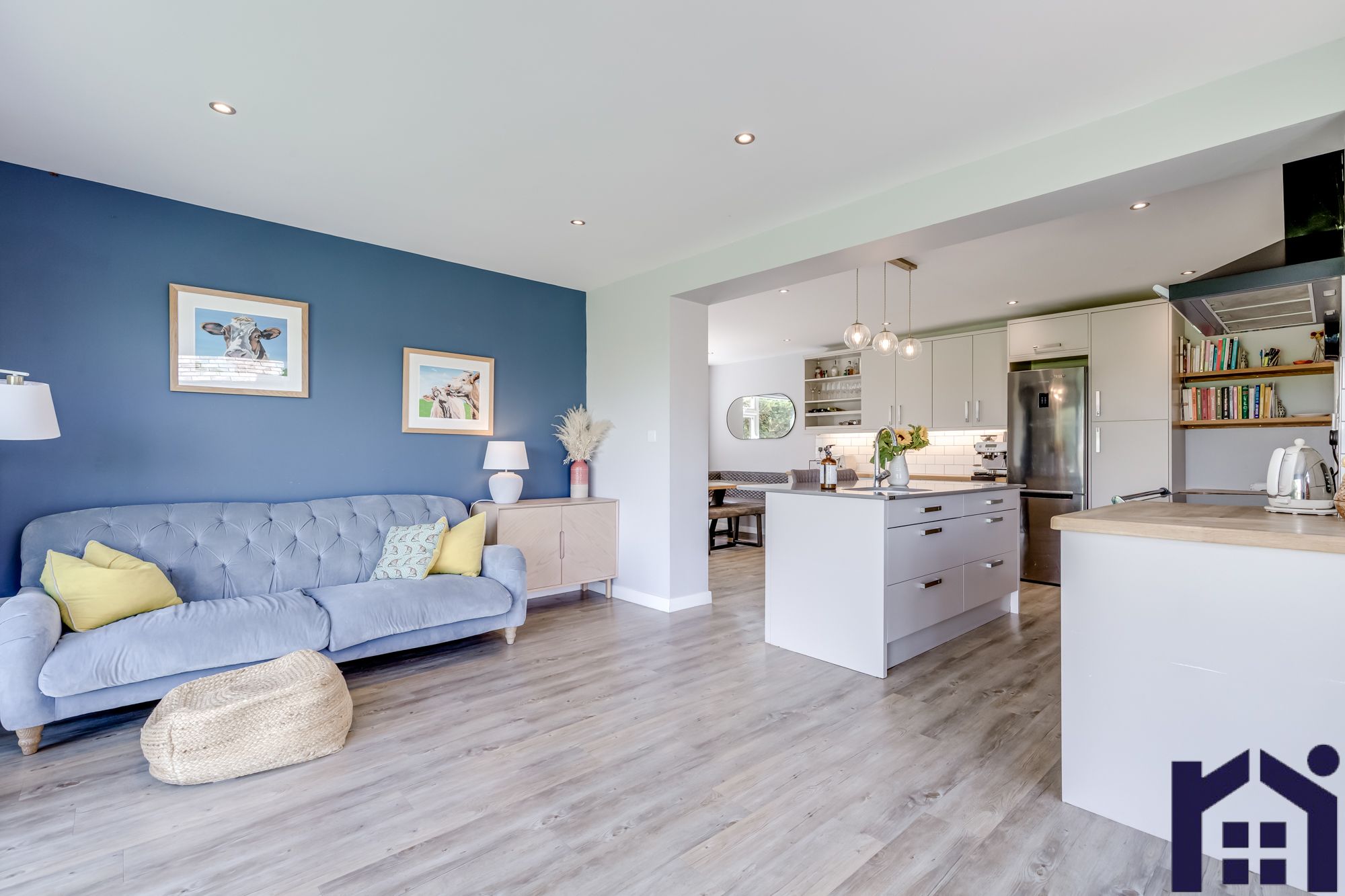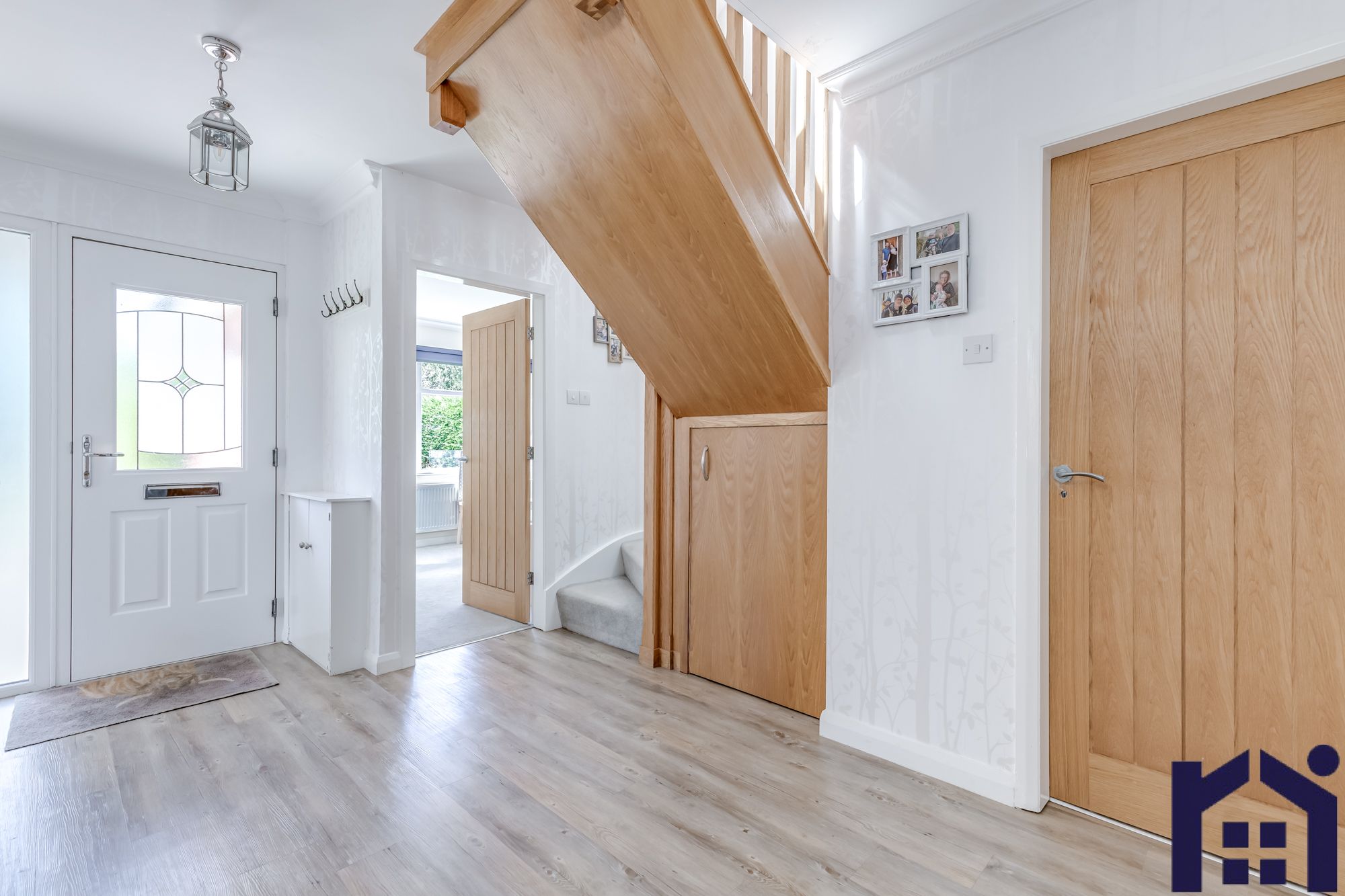 Step into the welcoming hallway with built in storage and Karndean flooring which runs through much of the ground floor, and from there to the living room with windows to two elevations and multifuel stove to keep you nice and cosy.  To the rear, the heart of the home has plenty of space for both dining and comfortable furniture with bifolding and patio doors out with electric somfy blinds. The kitchen comprises a range of wall and base units with central island and Silestone top and breakfast bar with integrity sink, integrated dishwasher and space for additional appliances.  A door leads to the separate utility/boot room, perfect for decanting muddy children and dogs.