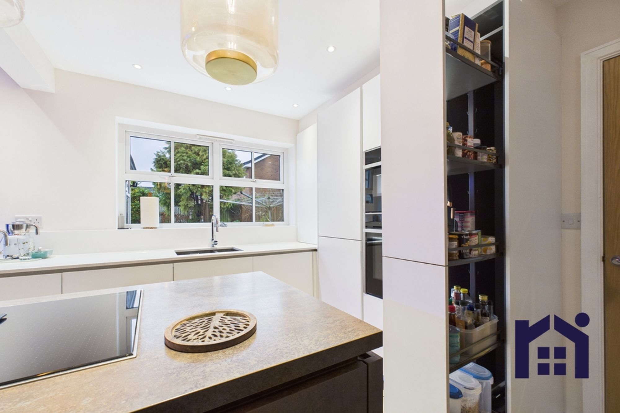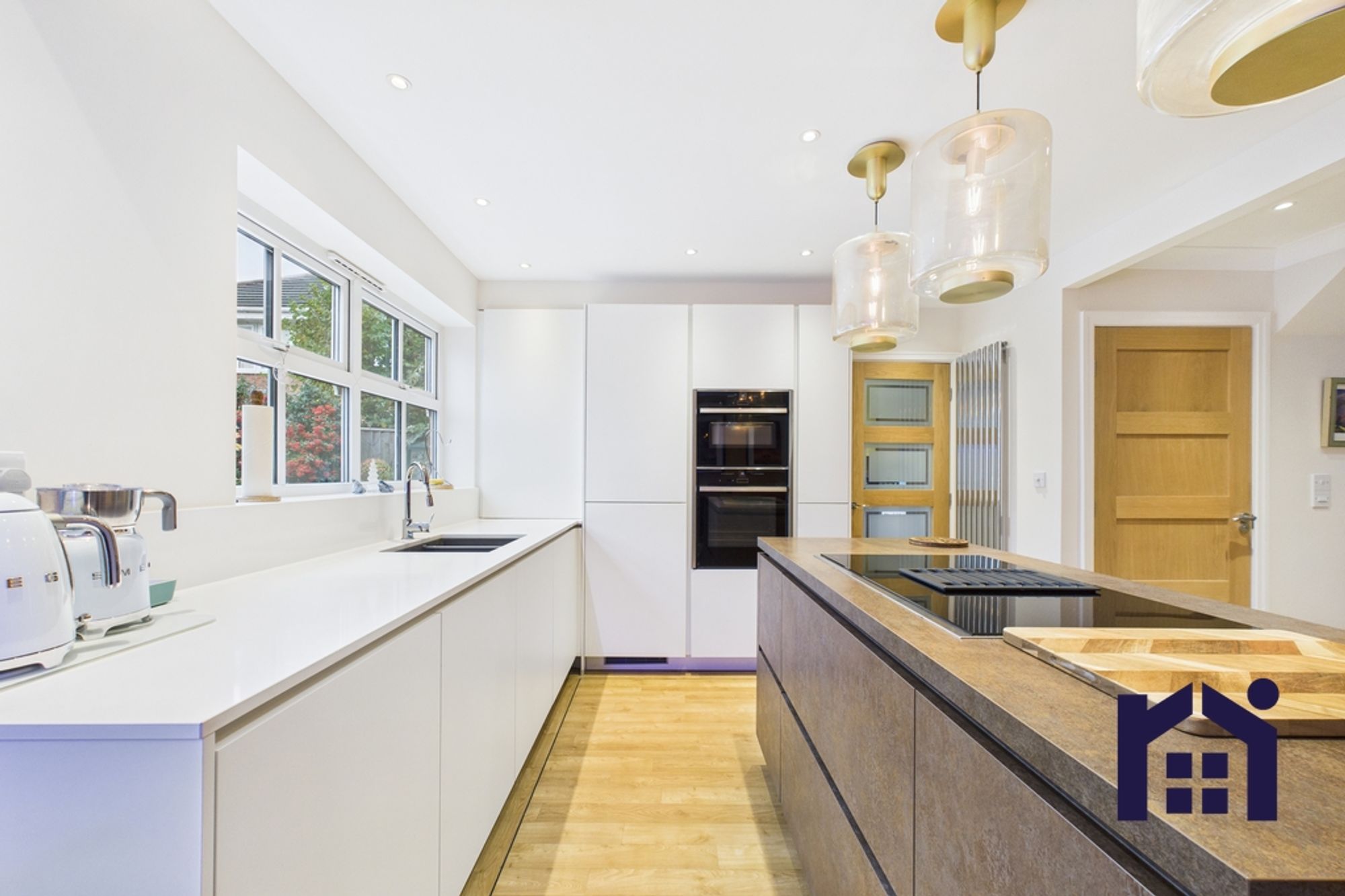 Double doors open to the spacious living room with bay window and feature, remote controlled electric fire.  The heart of the home has plenty of room for both dining and comfortable furniture with the Alno kitchen comprising a range of wall and base units with central island, quartz work surface and drainer, induction hob with downdraft extractor & double electric oven and grill by Neff, refrigerator and freezer.  A separate utility room offers more storage and space, power & plumbing for additional appliances.