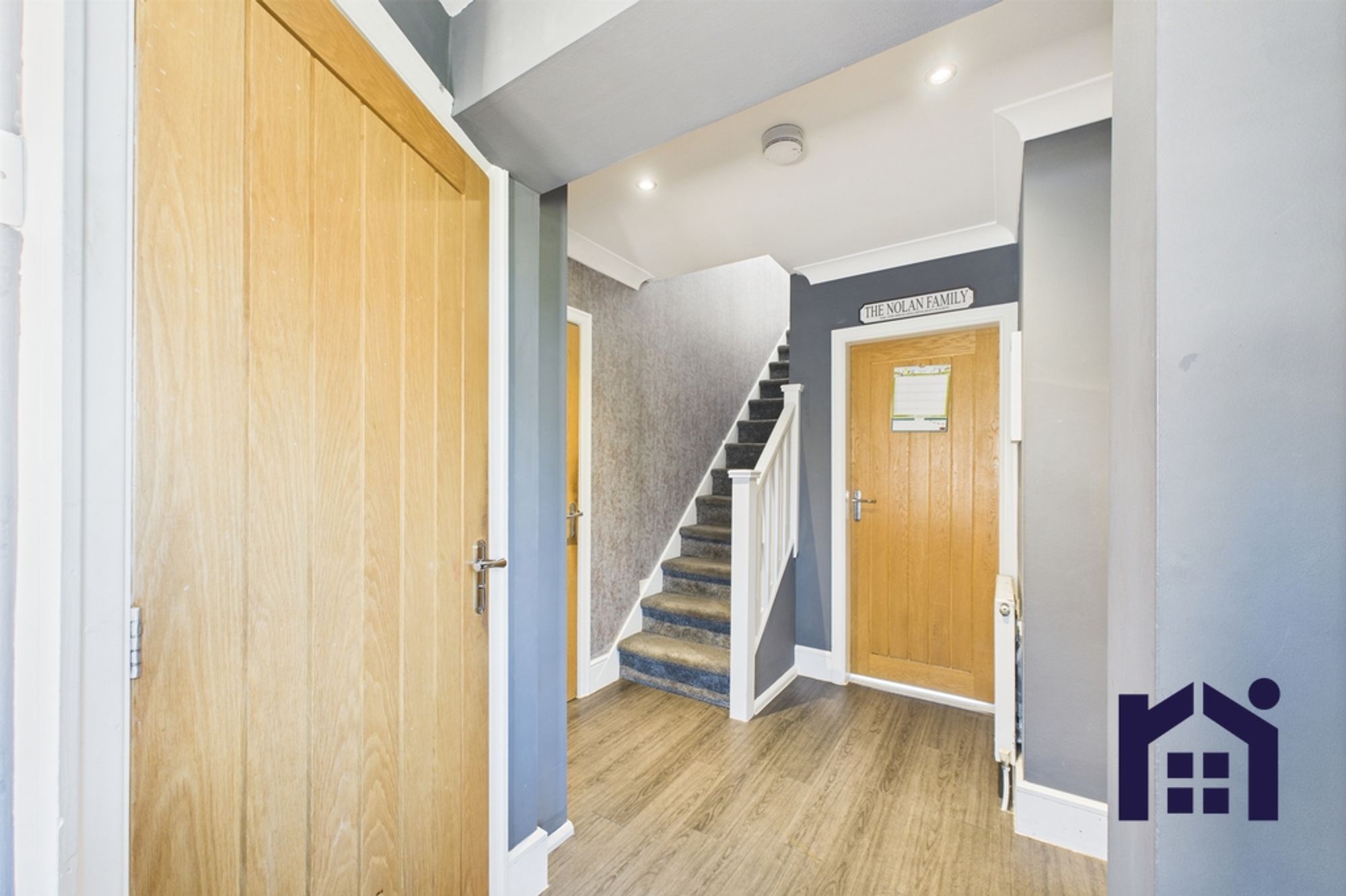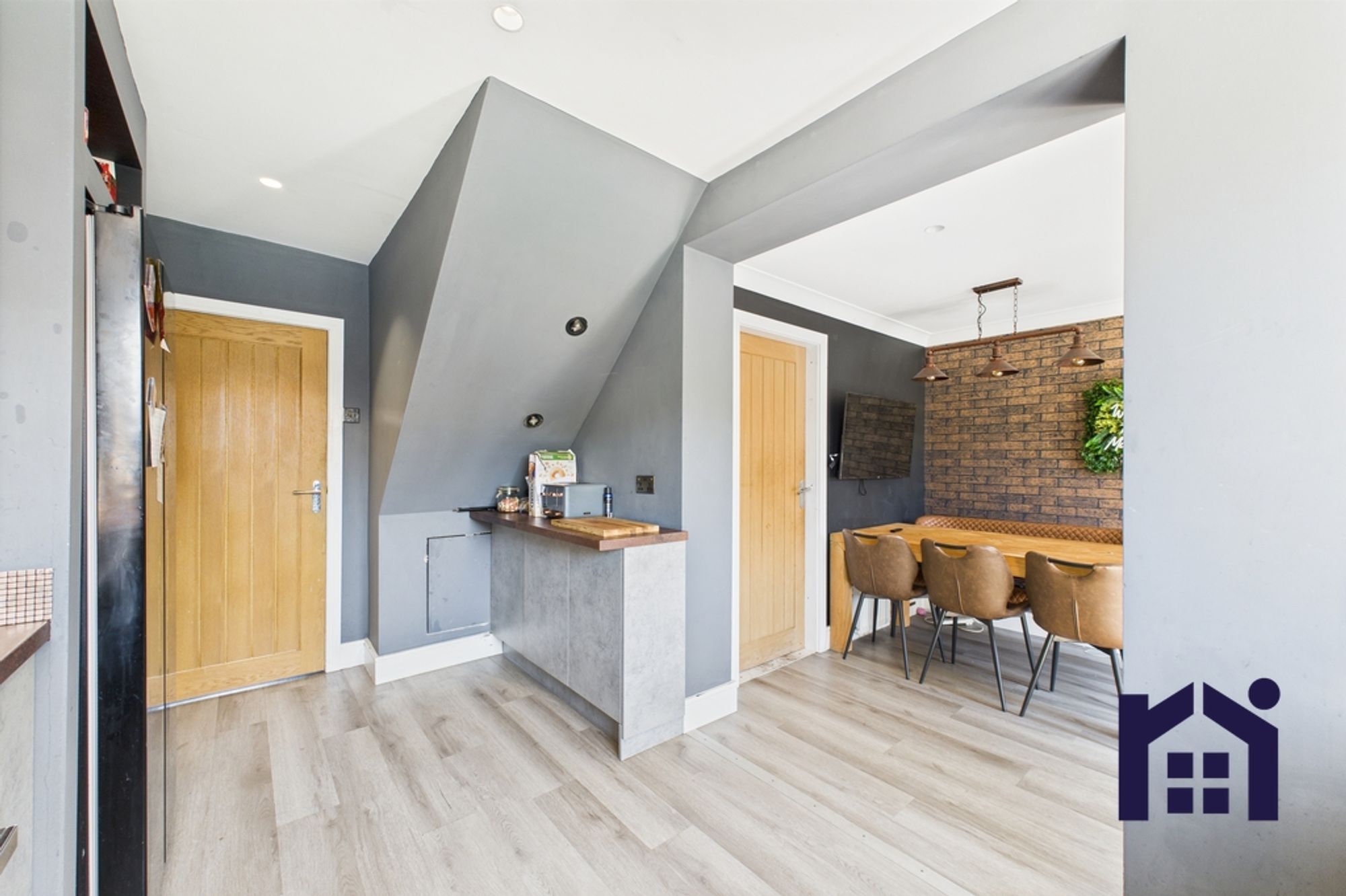 The block paviour driveway can accommodate three vehicles and leads to the main entrance. Step into the hallway with cloakroom off comprising wc and wash hand basin, and access to storage.