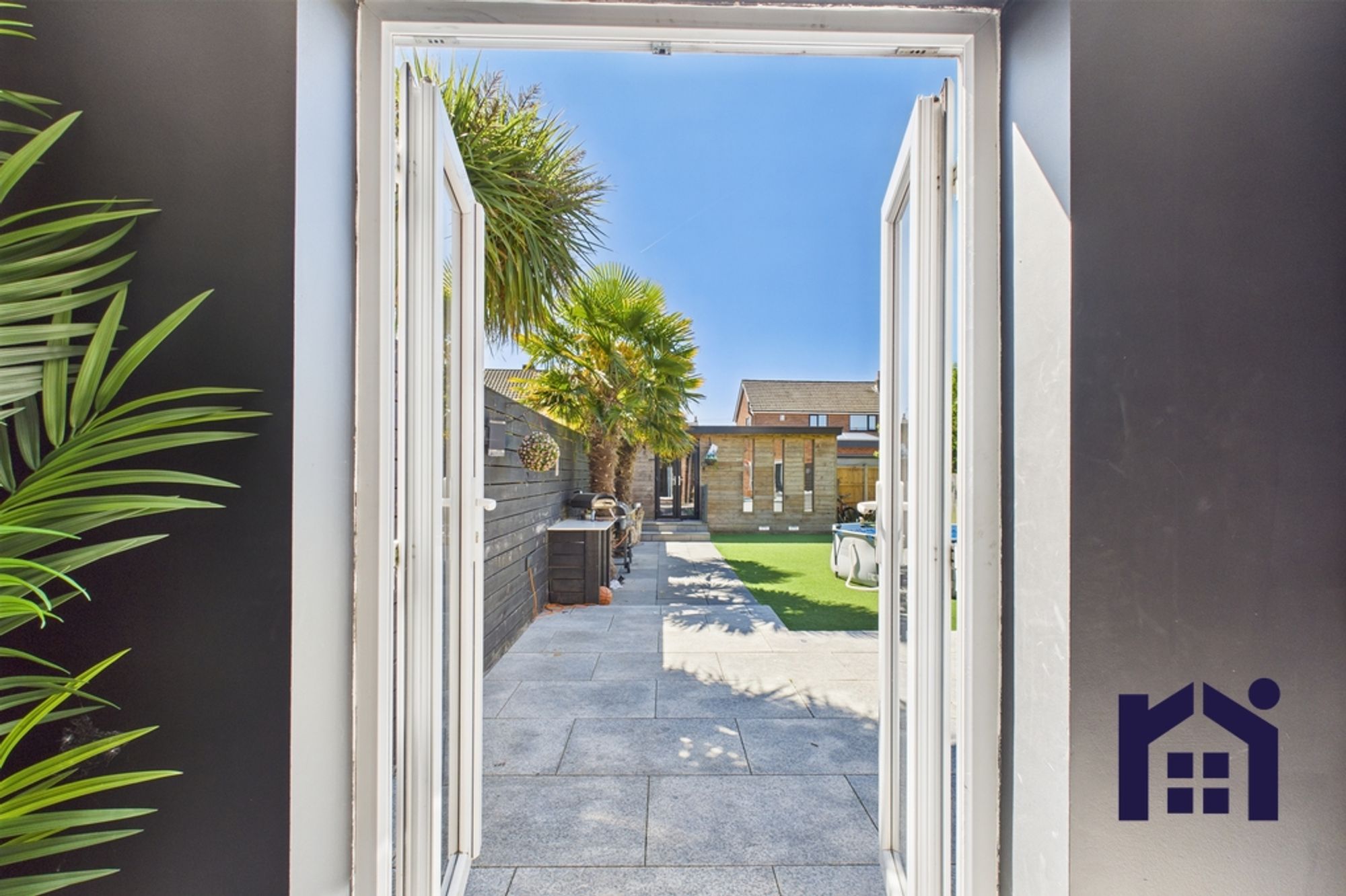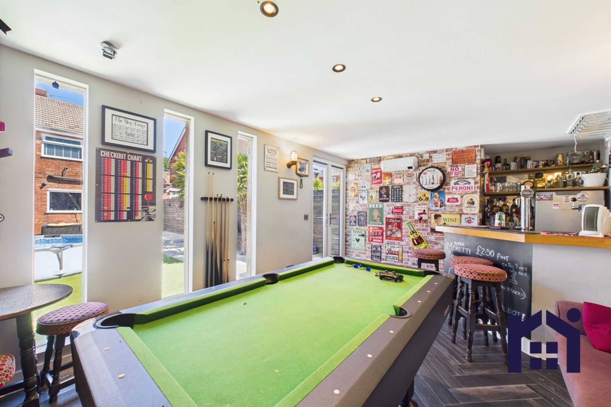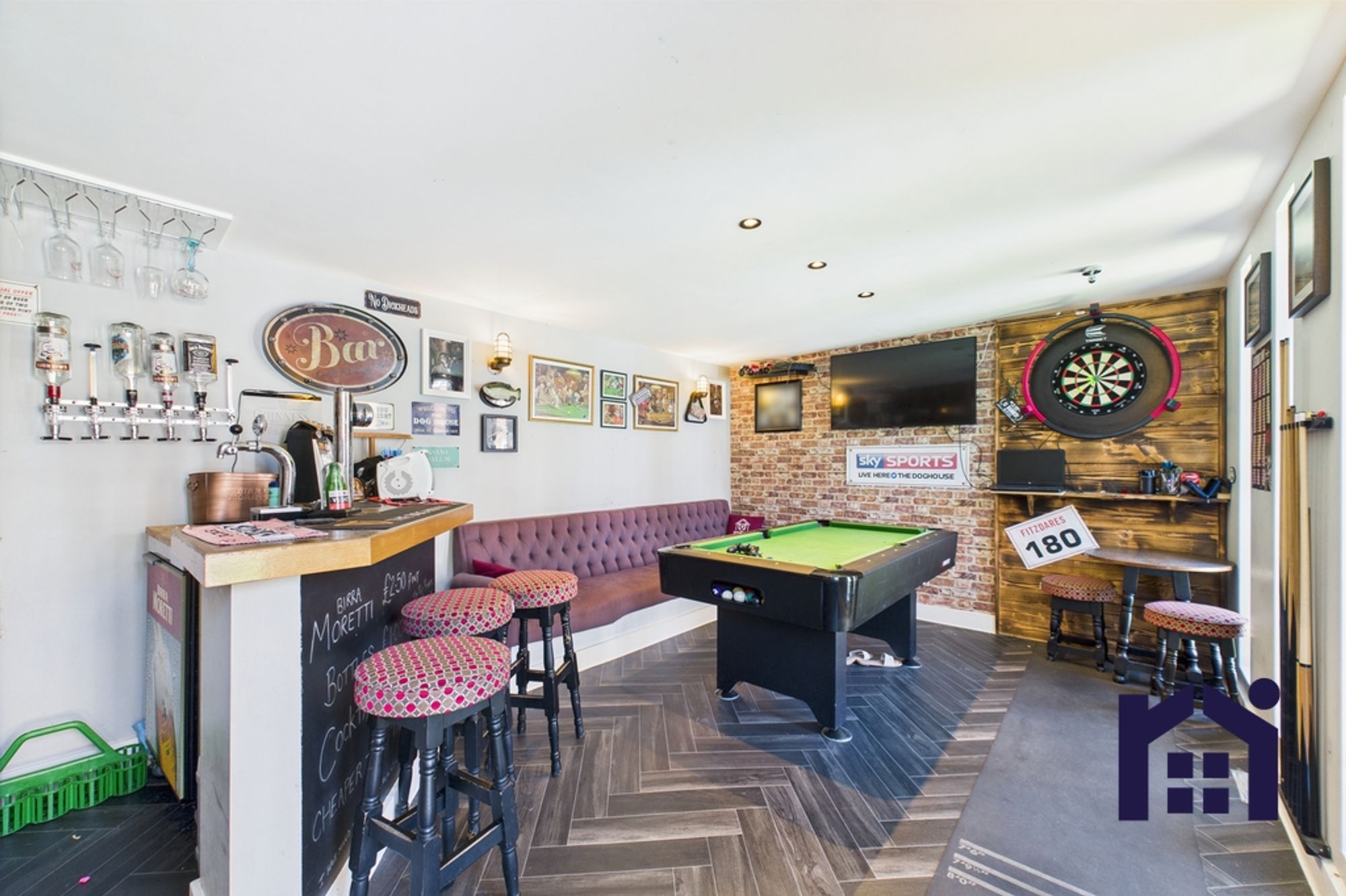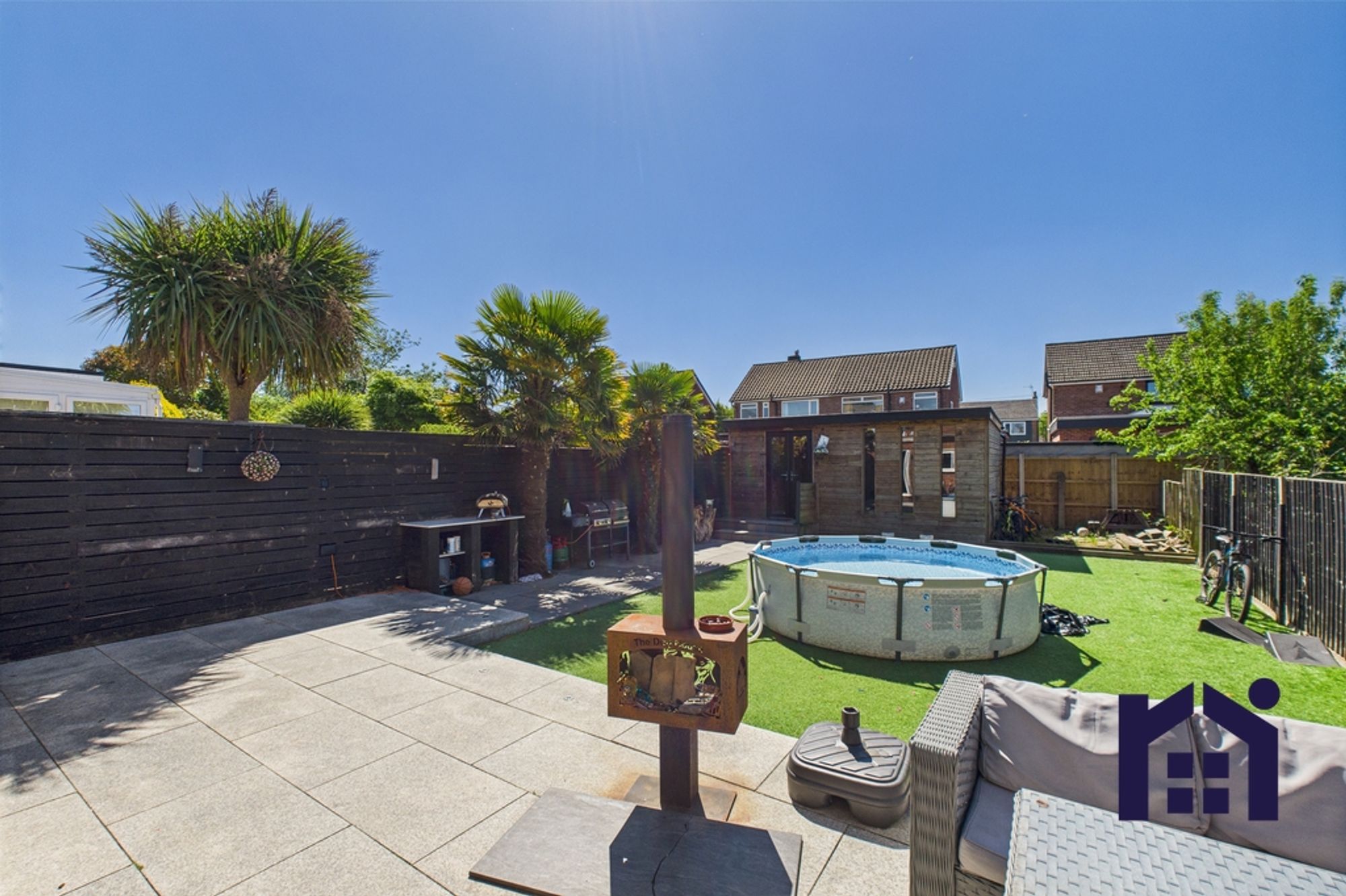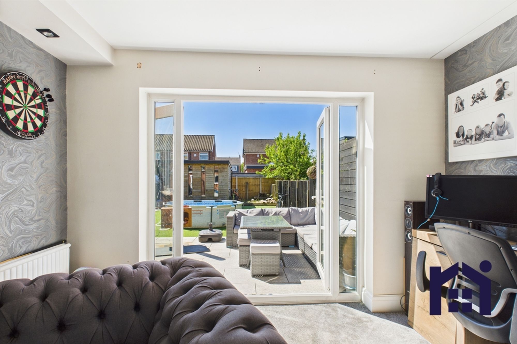 Step outside into the south facing garden with large sun terrace, lazy lawn and pathway down to the bespoke garden room which offers a variety of uses from bar to home office.