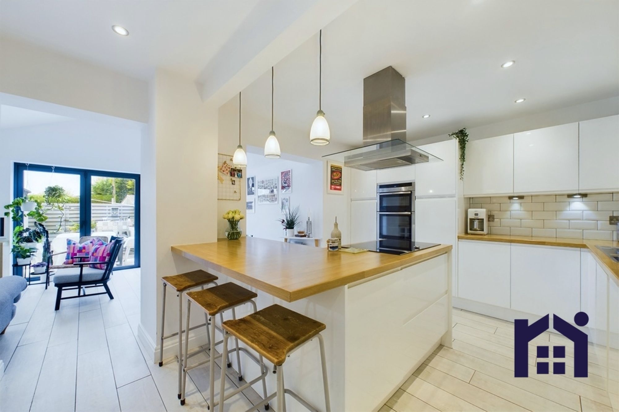 Trifolding doors open to the private, west facing garden, designed and constructed for relaxation and entertainment with both friends and family and having porcelain tiles, raised beds, bar and fireplace with built in seating. There is plenty of storage and additional space to the side, and to the rear is parking for up to three vehicles.