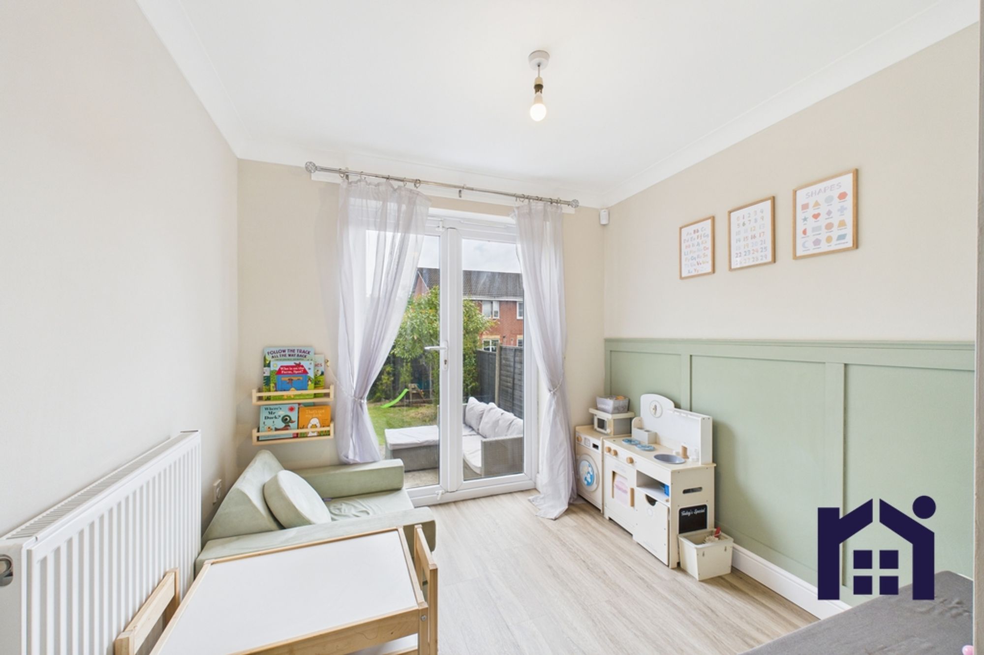 To the front, the tarmacadam driveway can accommodate two vehicles and leads to the main entrance. Step into the welcoming hallway with cloakroom off comprising wc and wash hand basin. The stylish living room has panelled walls and remote controlled inset feature electric fire, and gives on to the home office to the rear which is currently in use as a playroom.