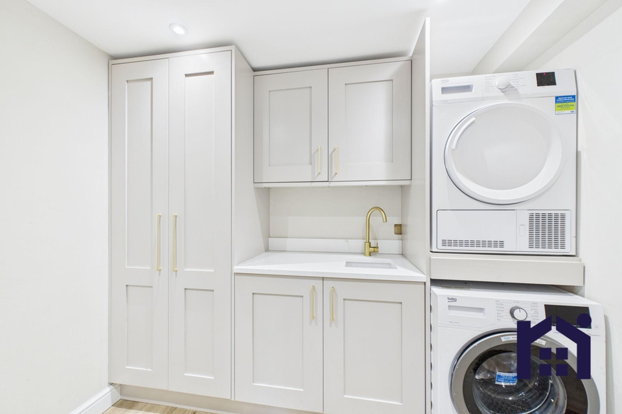 The spacious utility room offers additional units with space, power and plumbing for appliances, access to storage and cloakroom off.