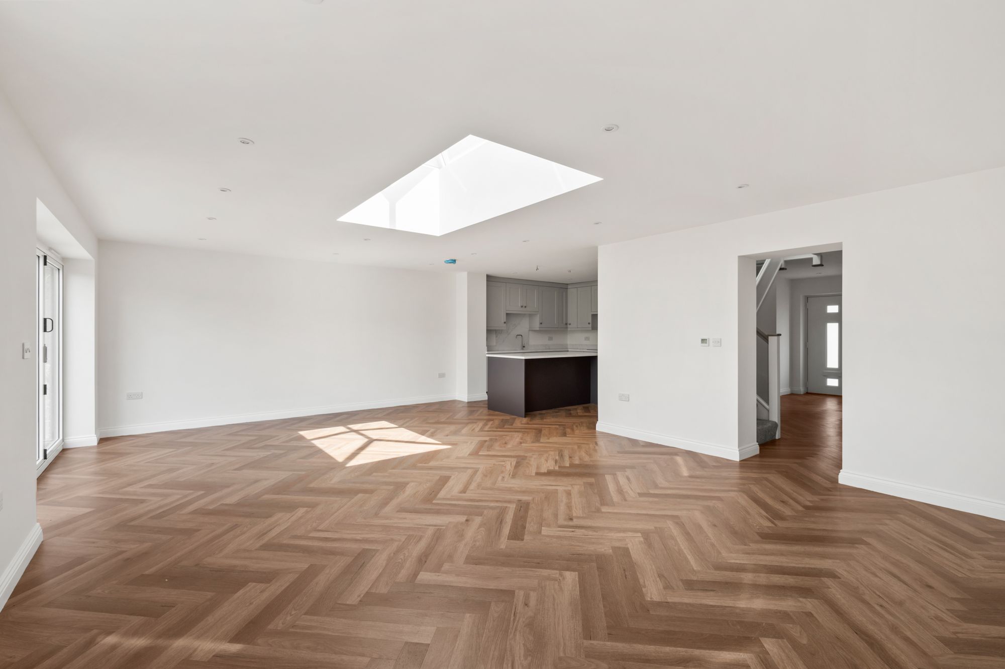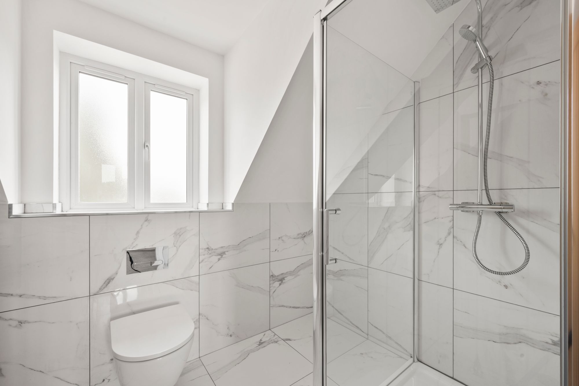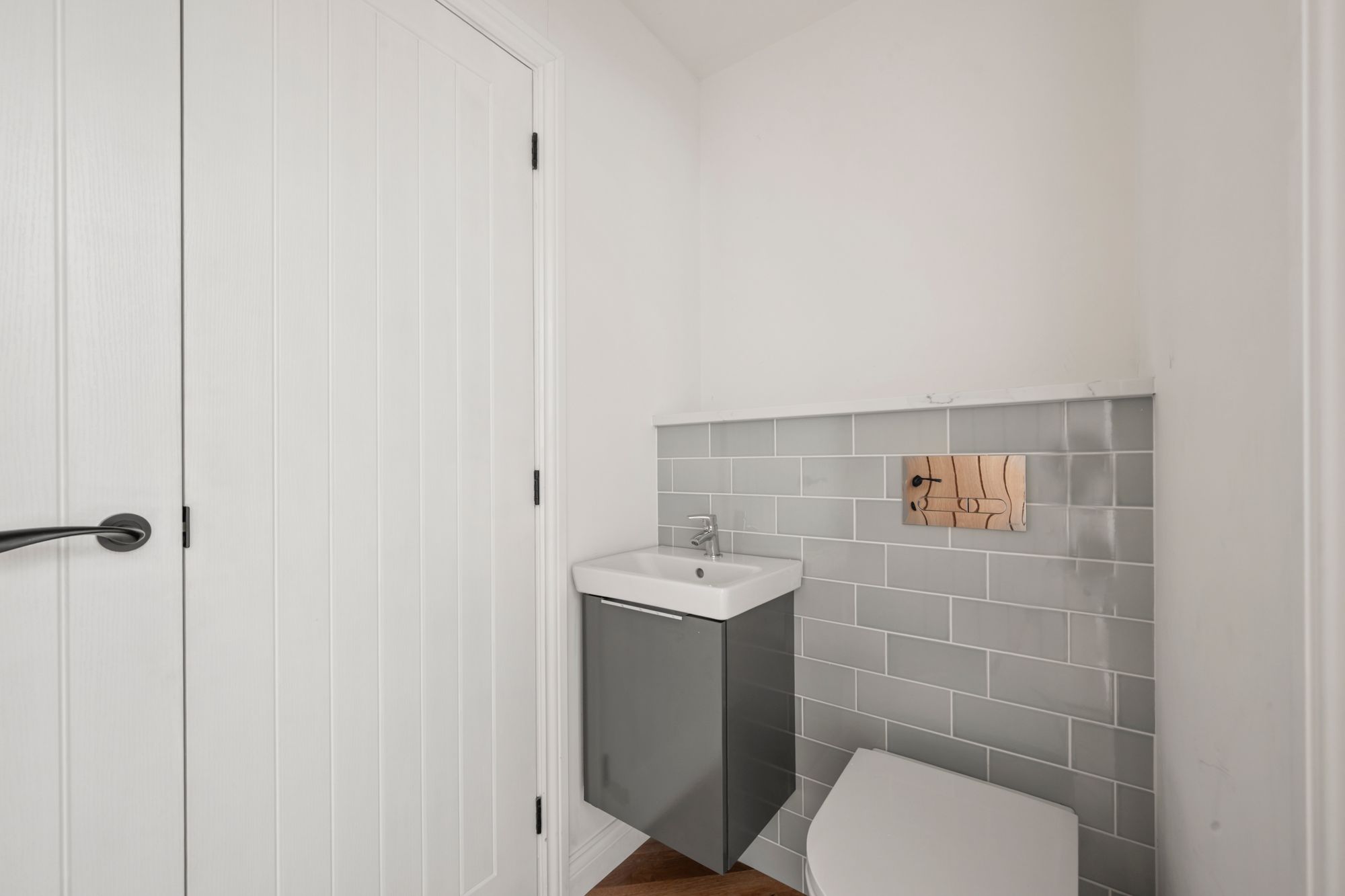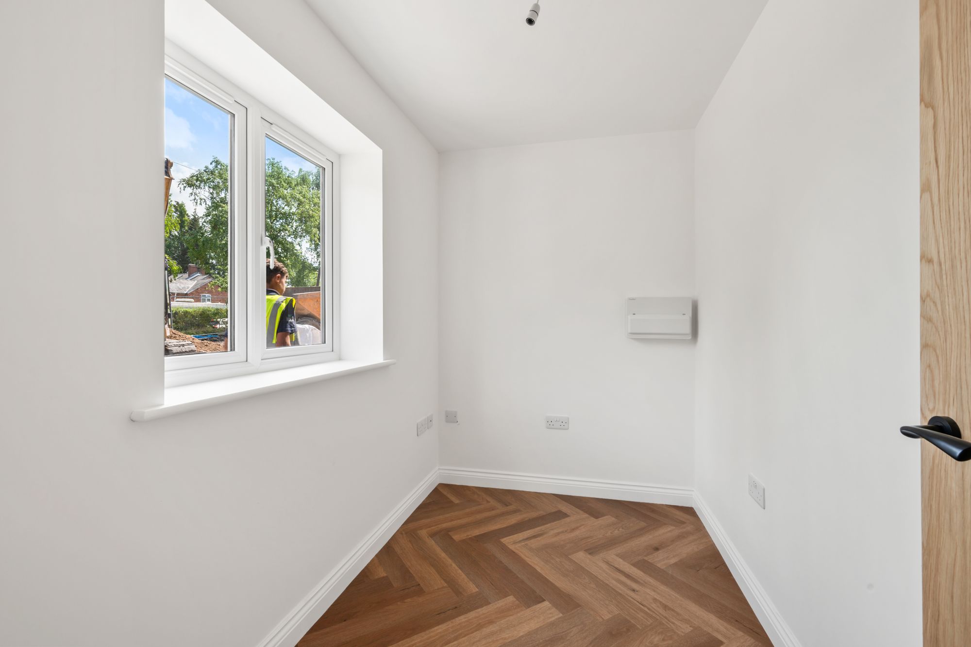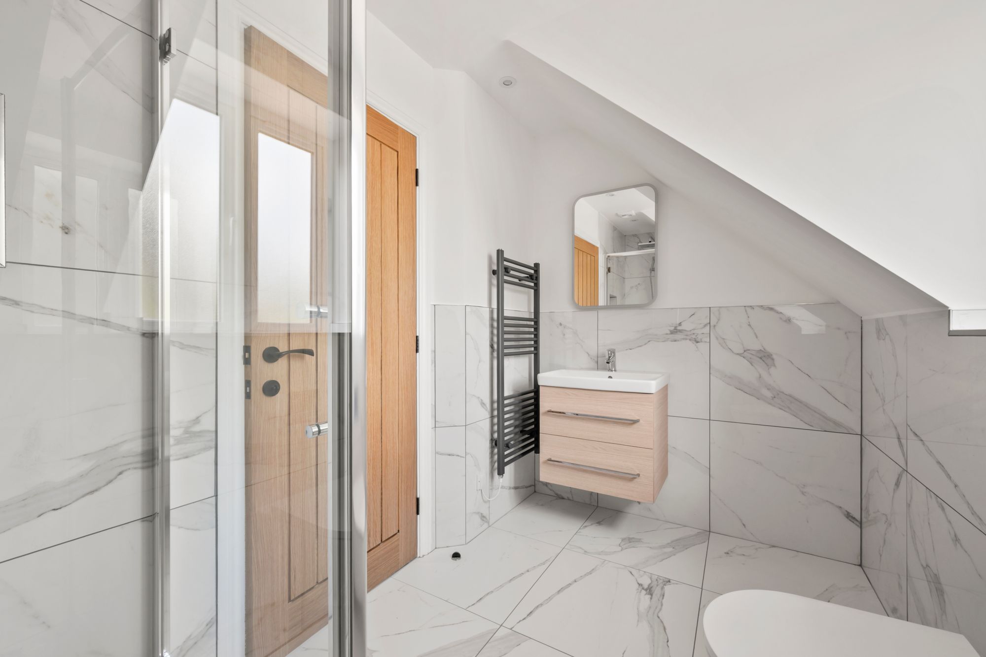 Step into the wide and welcoming entrance hallway with luxury vinyl tile flooring which flows through most of the ground floor which benefits from underfloor heating.  To the left is the home office whilst to the right is the ground floor bedroom with en suite comprising wash hand basin on floating vanity, tiled elevations and flooring, wc and rainfall mixer shower in cubicle.