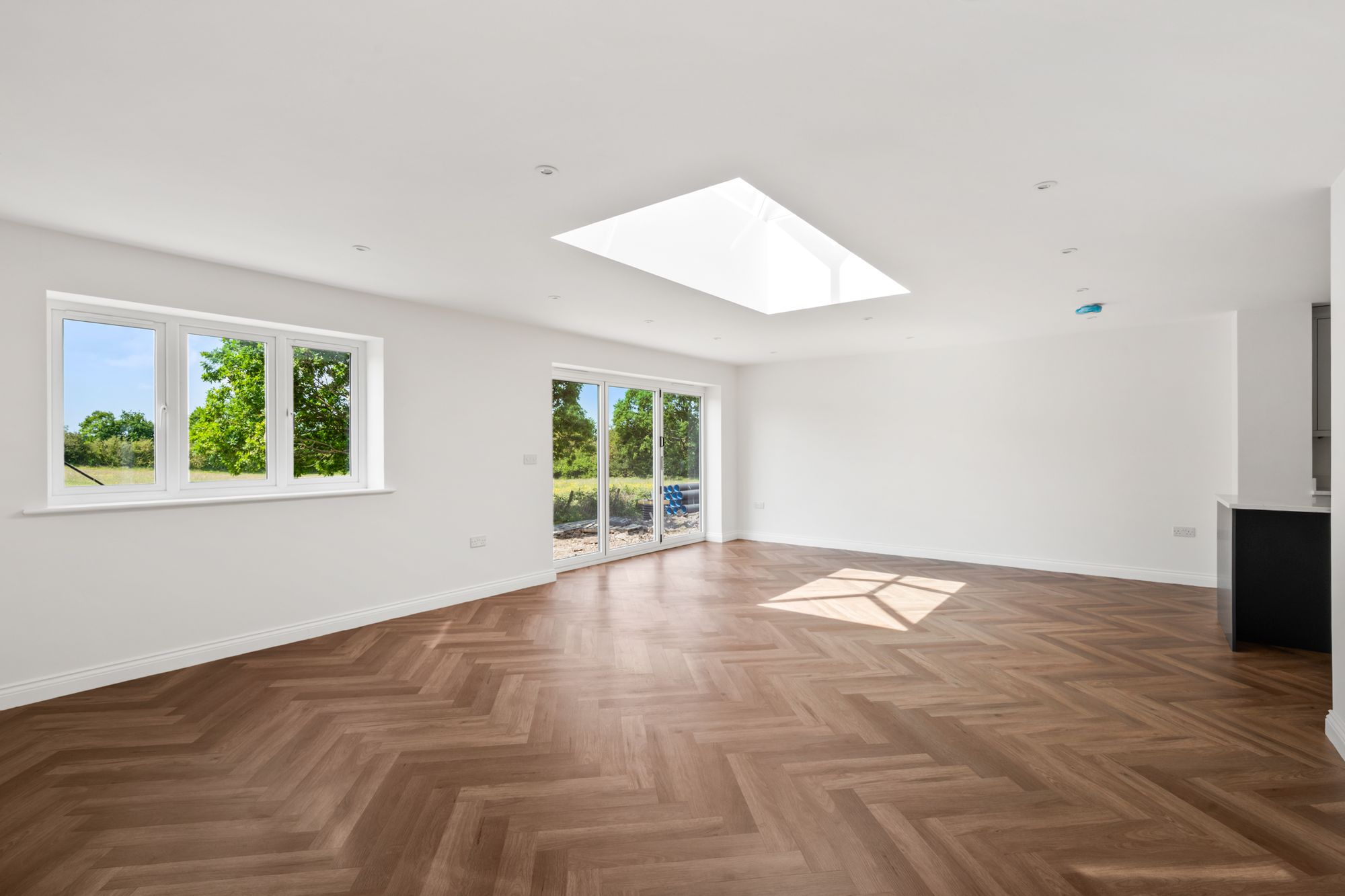 To the rear is the heart of the home with lantern and bifolding doors for plenty of natural light and views over open countryside,  ample space for both dining and comfortable furniture and kitchen comprising a range of wall and base units with central island and topped by granite work surfaces and splashbacks with etched drainer.  Integrated appliances are by Neff and include induction hob, multi oven, oven and grill, refrigerator, freezer and dishwasher.