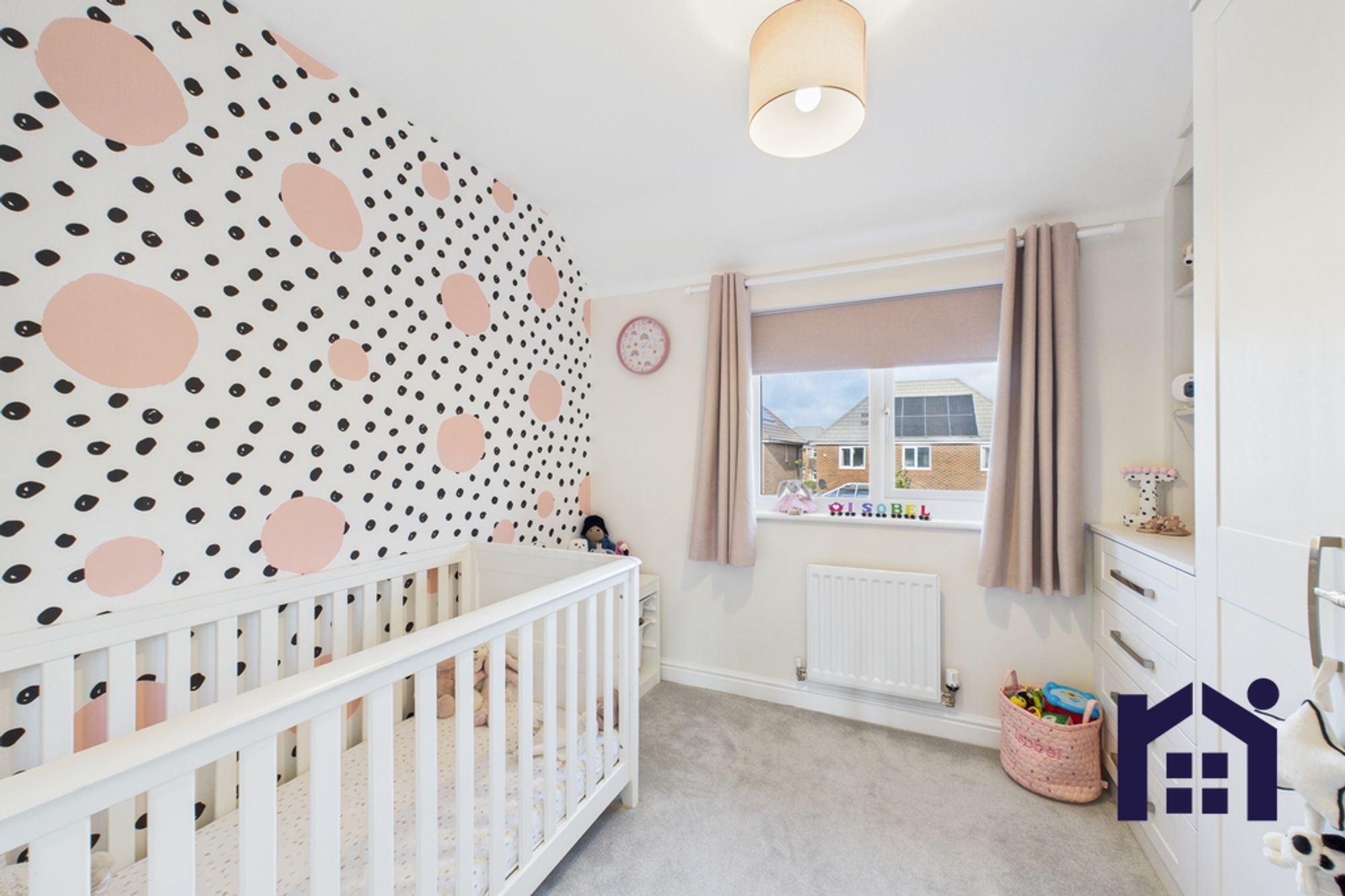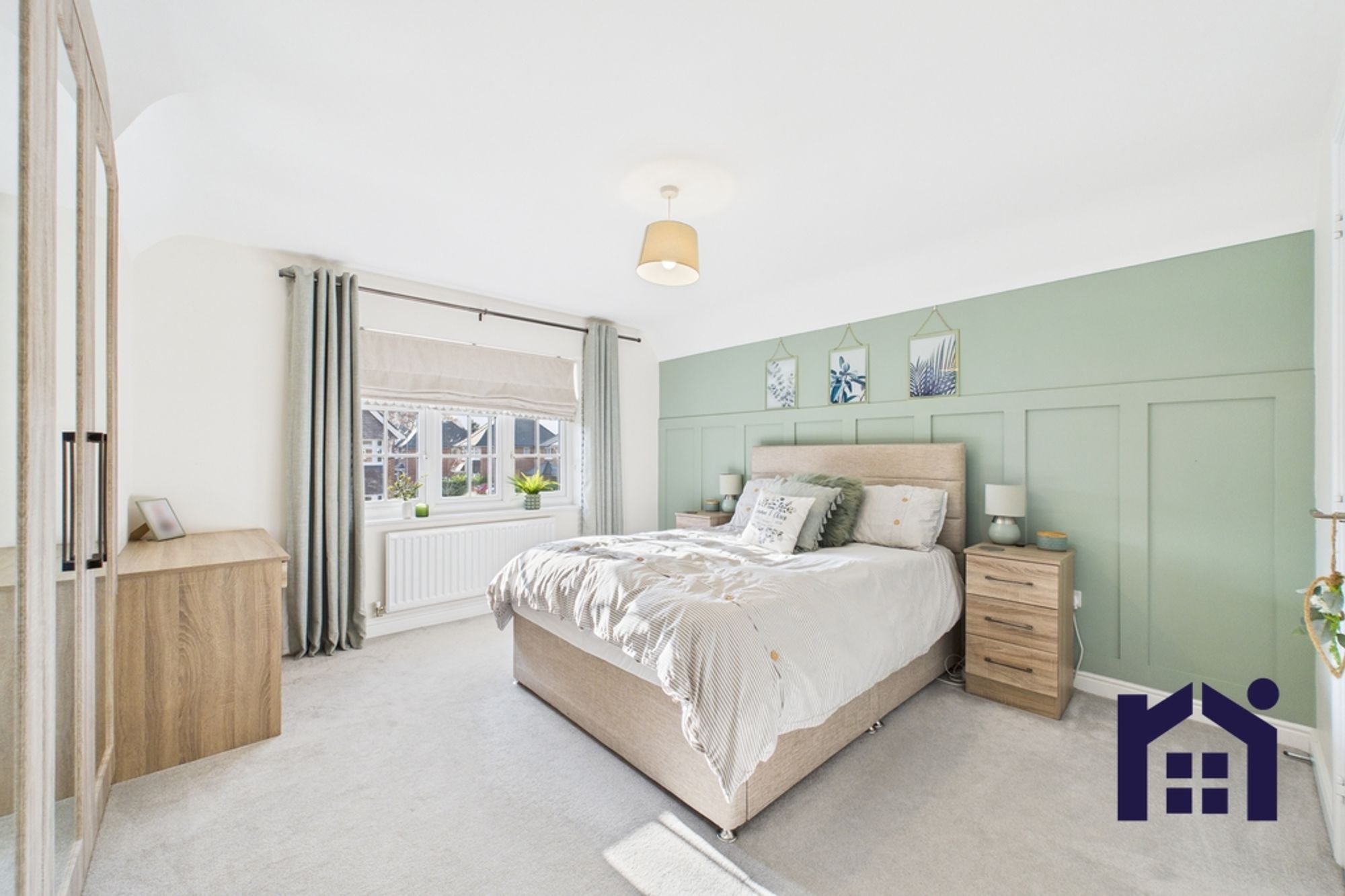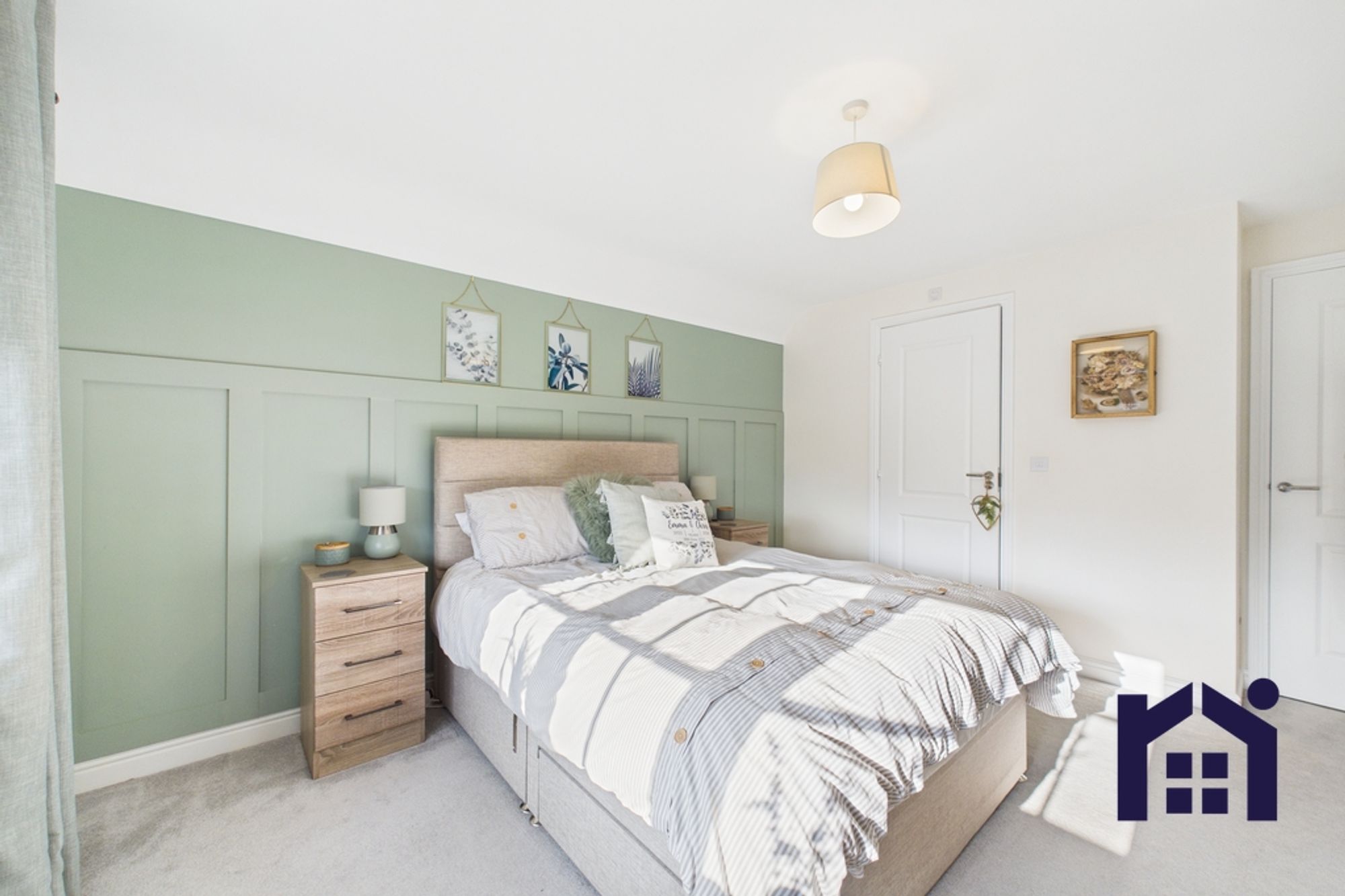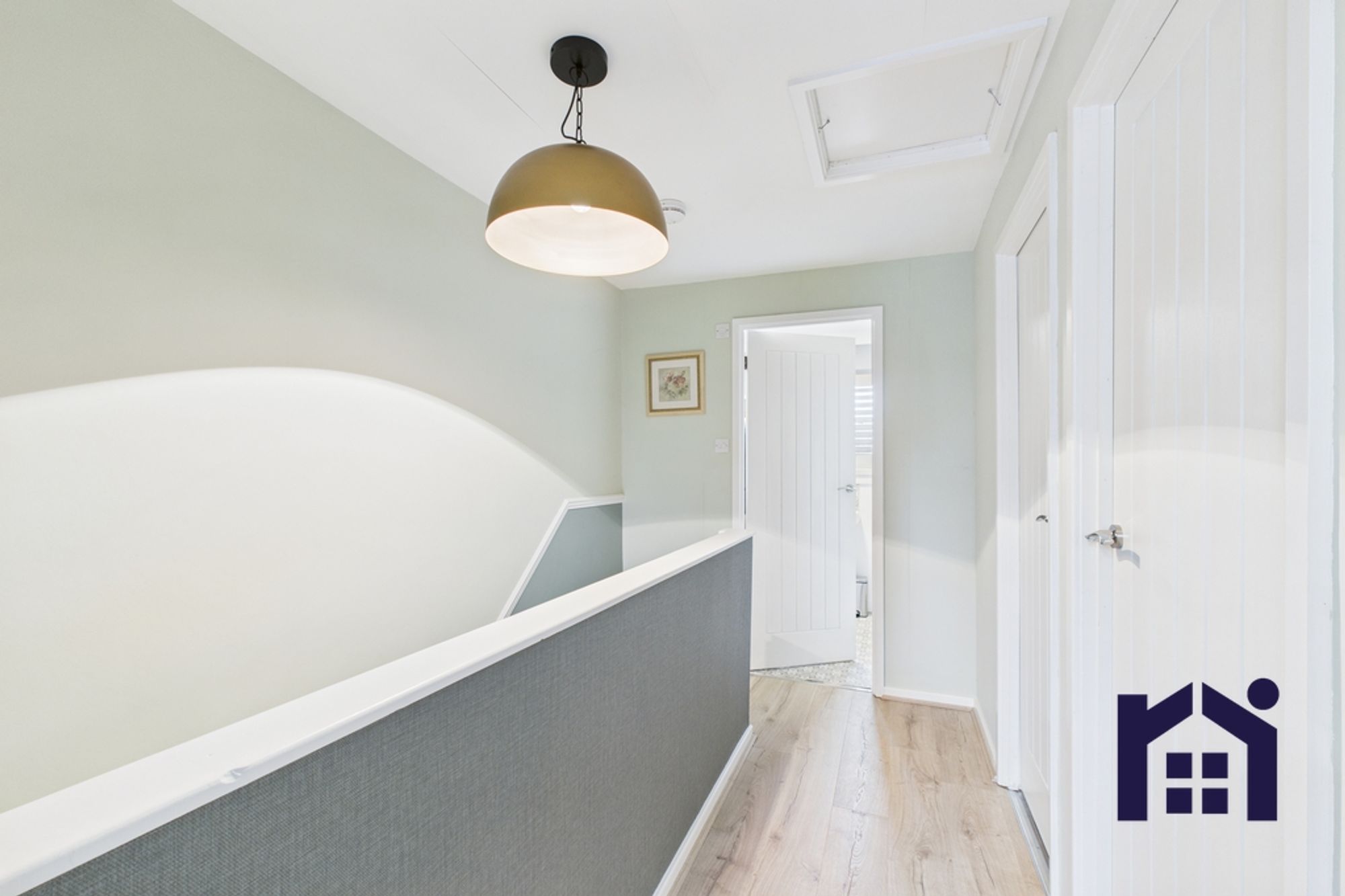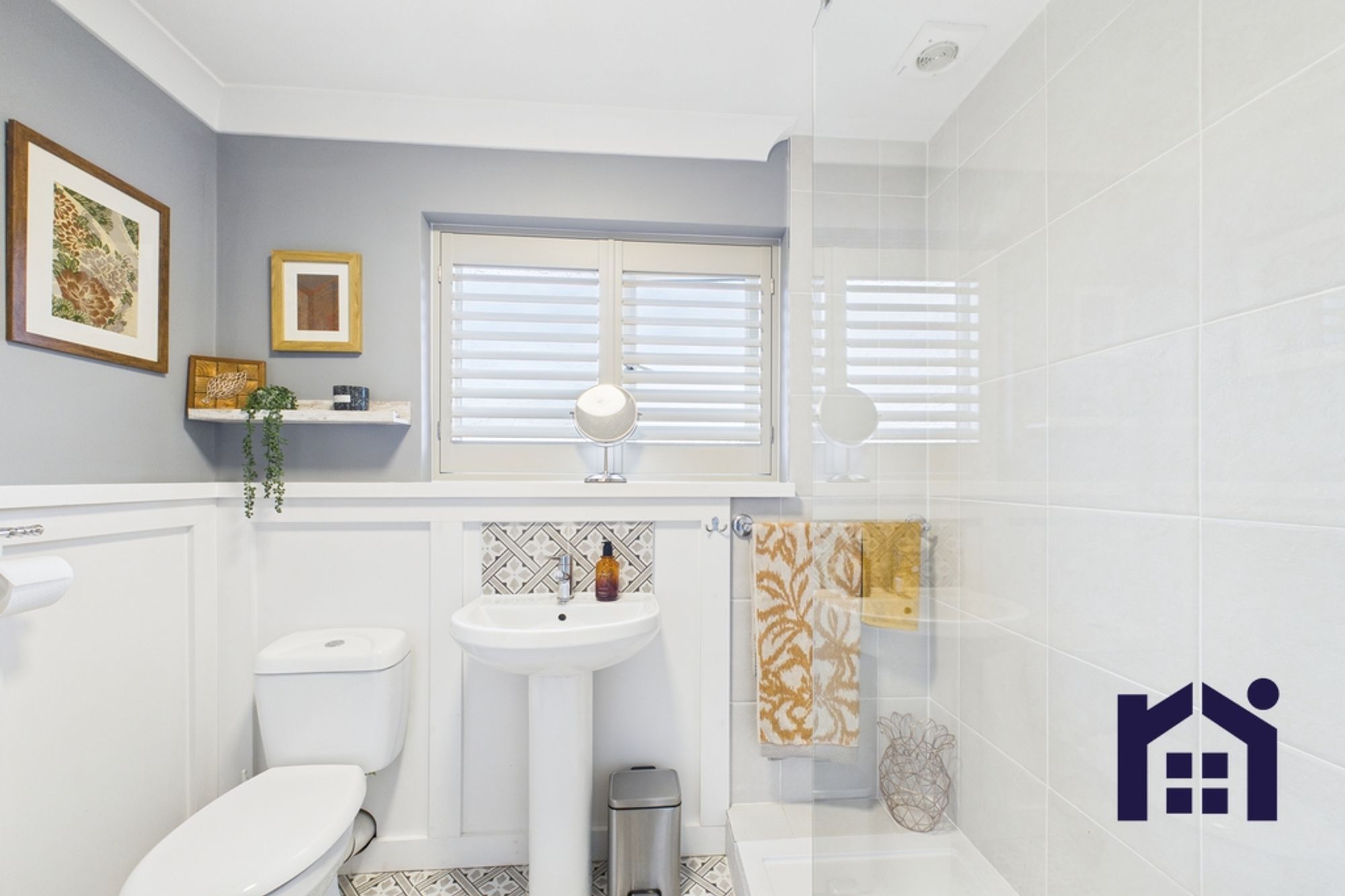 Upstairs, the first-floor landing offers an airing cupboard and loft access. The principal bedroom features stylish panelled walls, fitted wardrobes and an en suite shower room with mixer shower, floating wash hand basin, wc and ladder-style heated towel rail. There are two further double bedrooms (one with fitted wardrobes) and a comfortable single bedroom with built-in storage. The family bathroom comprises a bath with shower over and screen, wc, floating wash hand basin, and ladder heated towel rail.