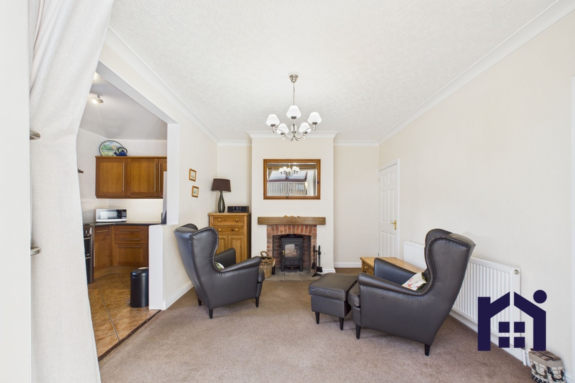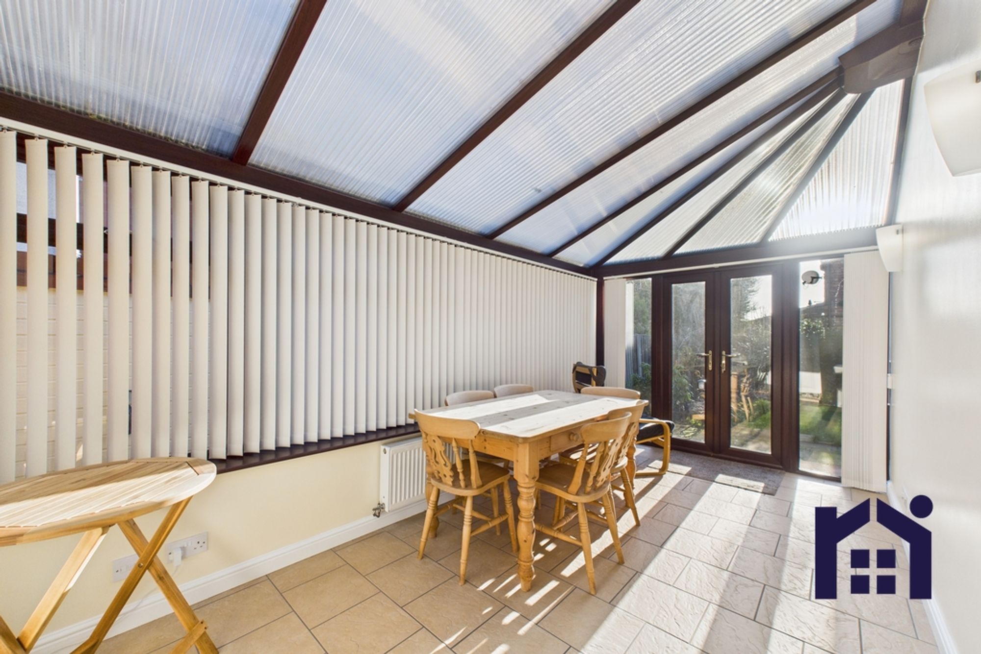 Reception Two is a cosy snug with wood-burning stove, which flows through to the conservatory, currently used as a dining room, and onward to the kitchen, comprising a range of wall and base units with space, power and plumbing for appliances. A courtesy door from the conservatory provides internal access to the garage, which benefits from space, power and plumbing for additional appliances, including the Vaillant combi boiler.
