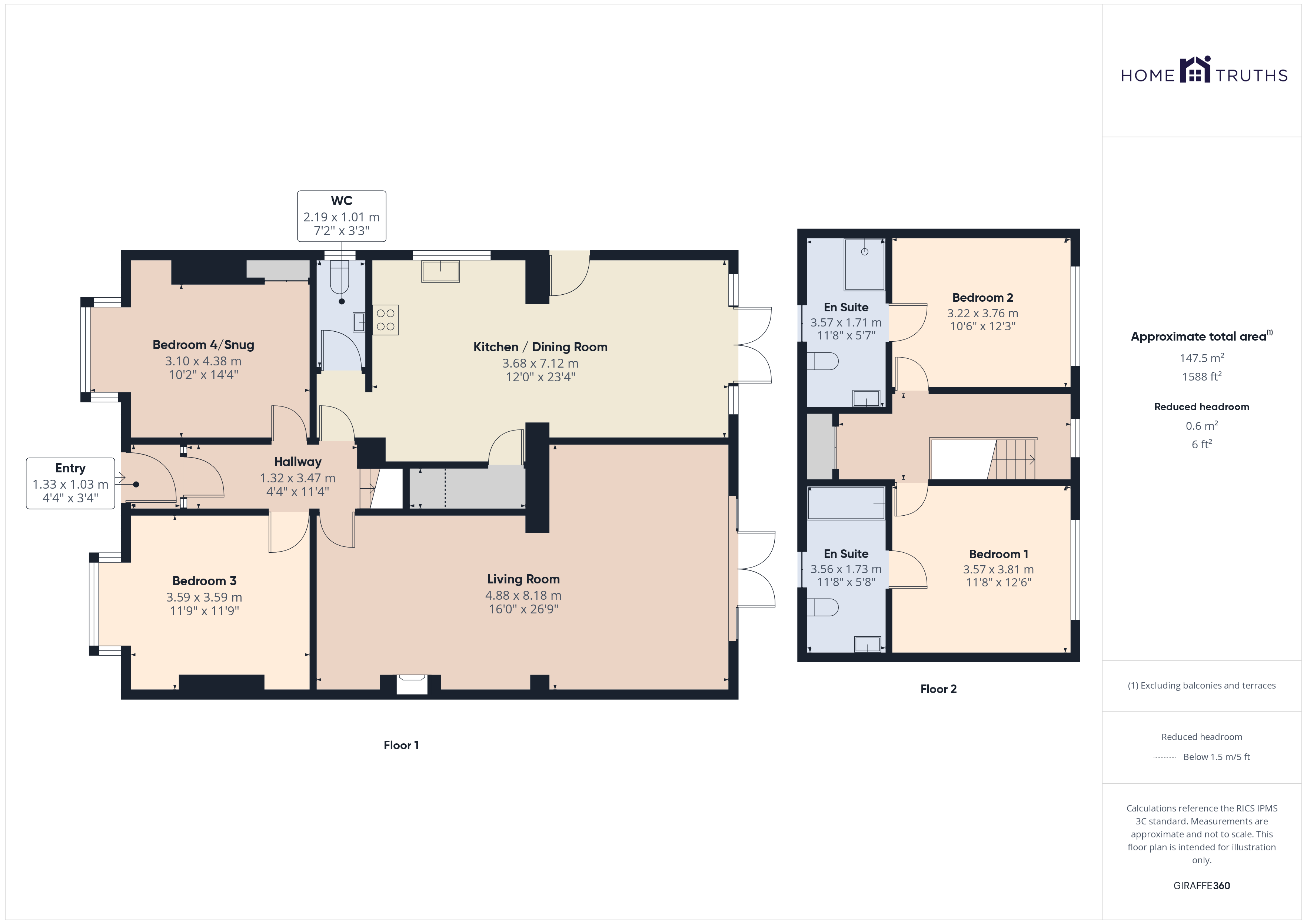 Back inside, stairs lead to the first floor landing with eaves storage. Both bedrooms have views over open countryside with the en suite to bedroom two comprising wash hand basin, wc, ladder heated towel rail and rainfall mixer shower in cubicle. The en suite to bedroom one benefits from wash hand basin, wc, p shaped bath with screen and electric shower over and ladder heated towel rail.