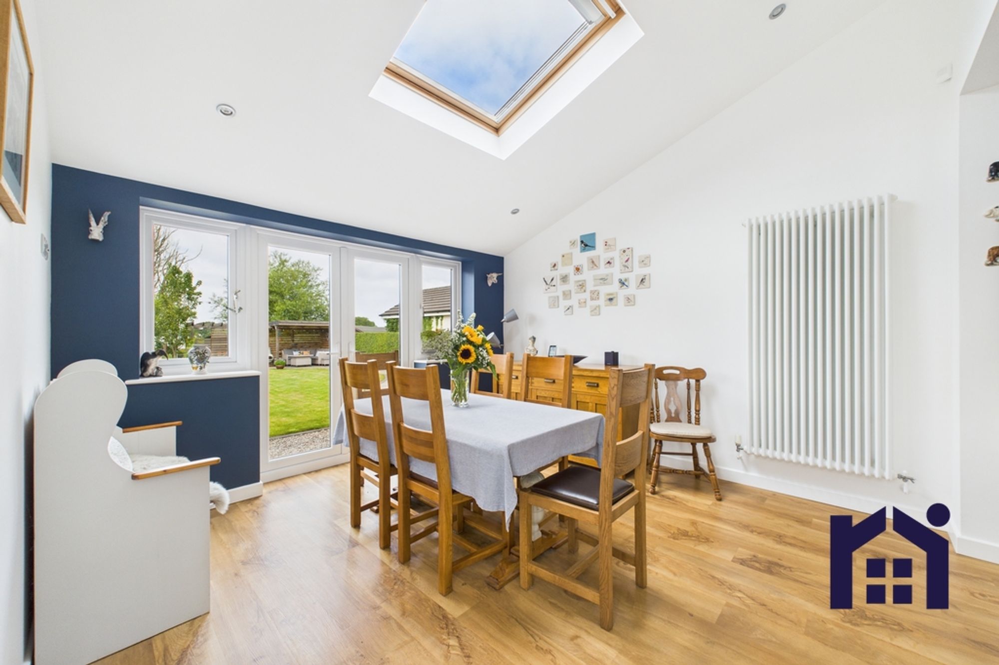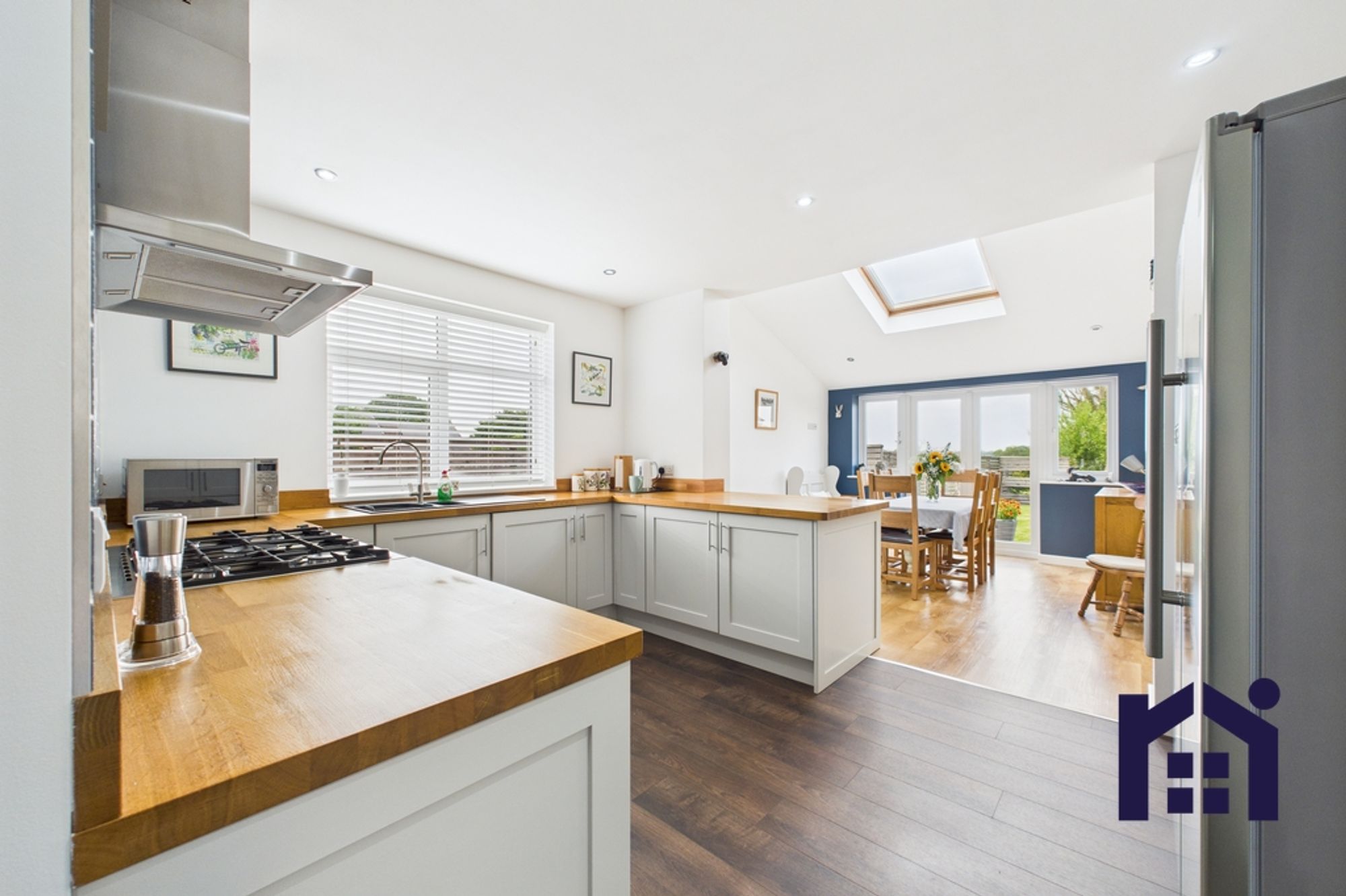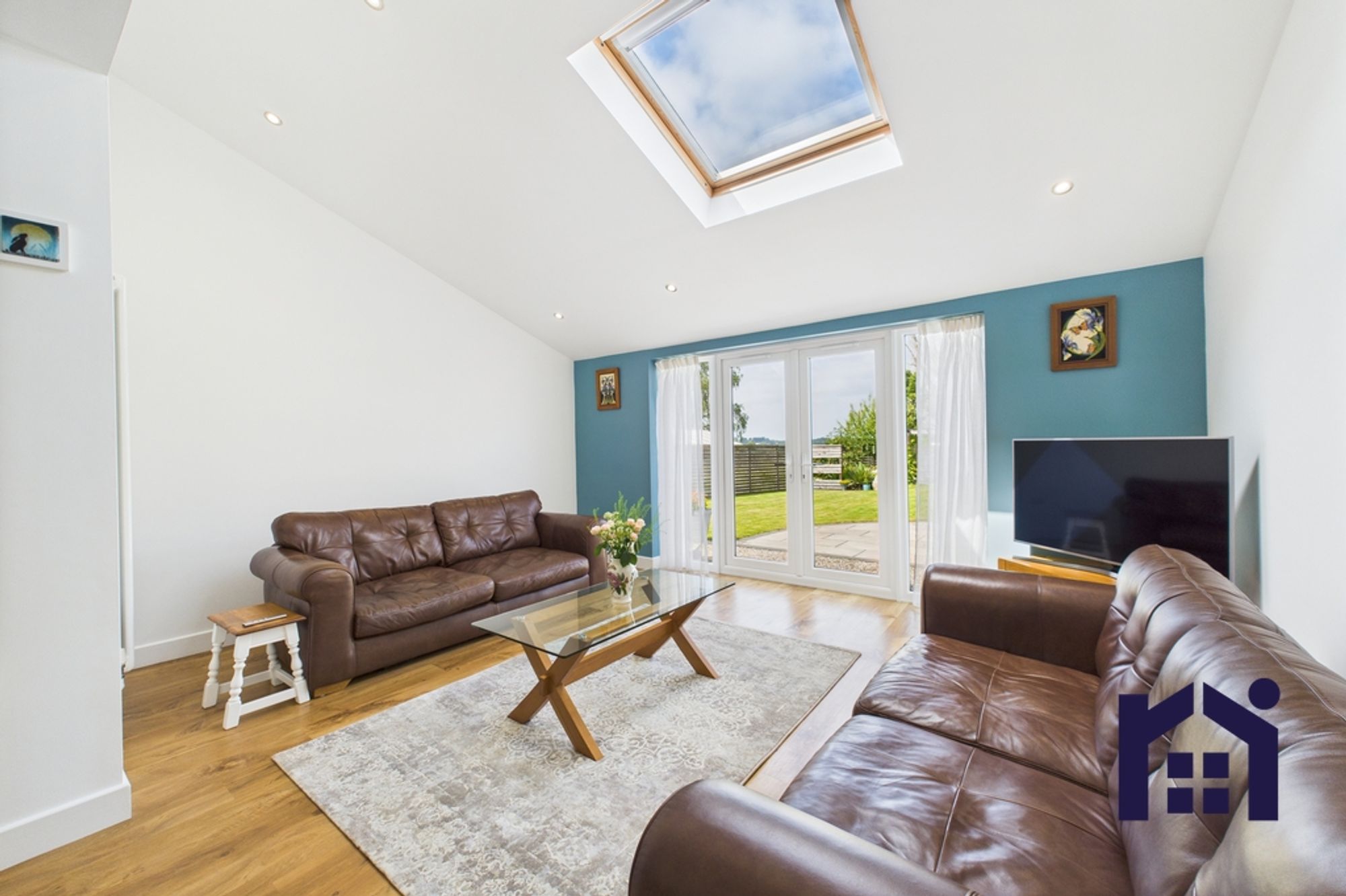 To the front are bedrooms three and four with the smaller currently enjoying life as a home office/snug. To the rear, the serene living room flows into the garden room with vaulted ceiling and plenty of natural light from patio doors and Velux windows.
