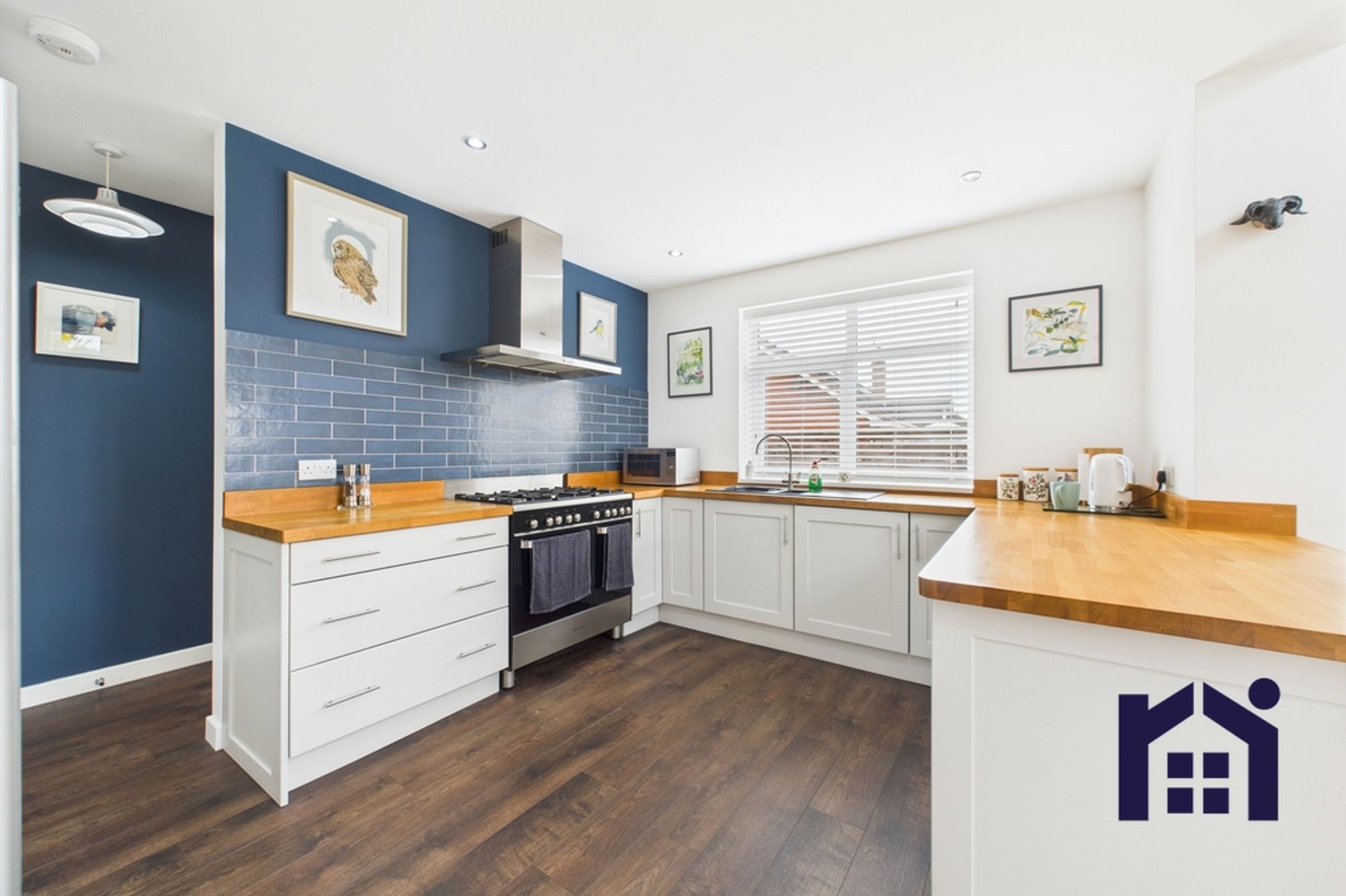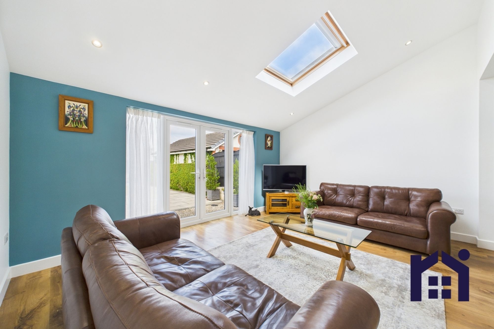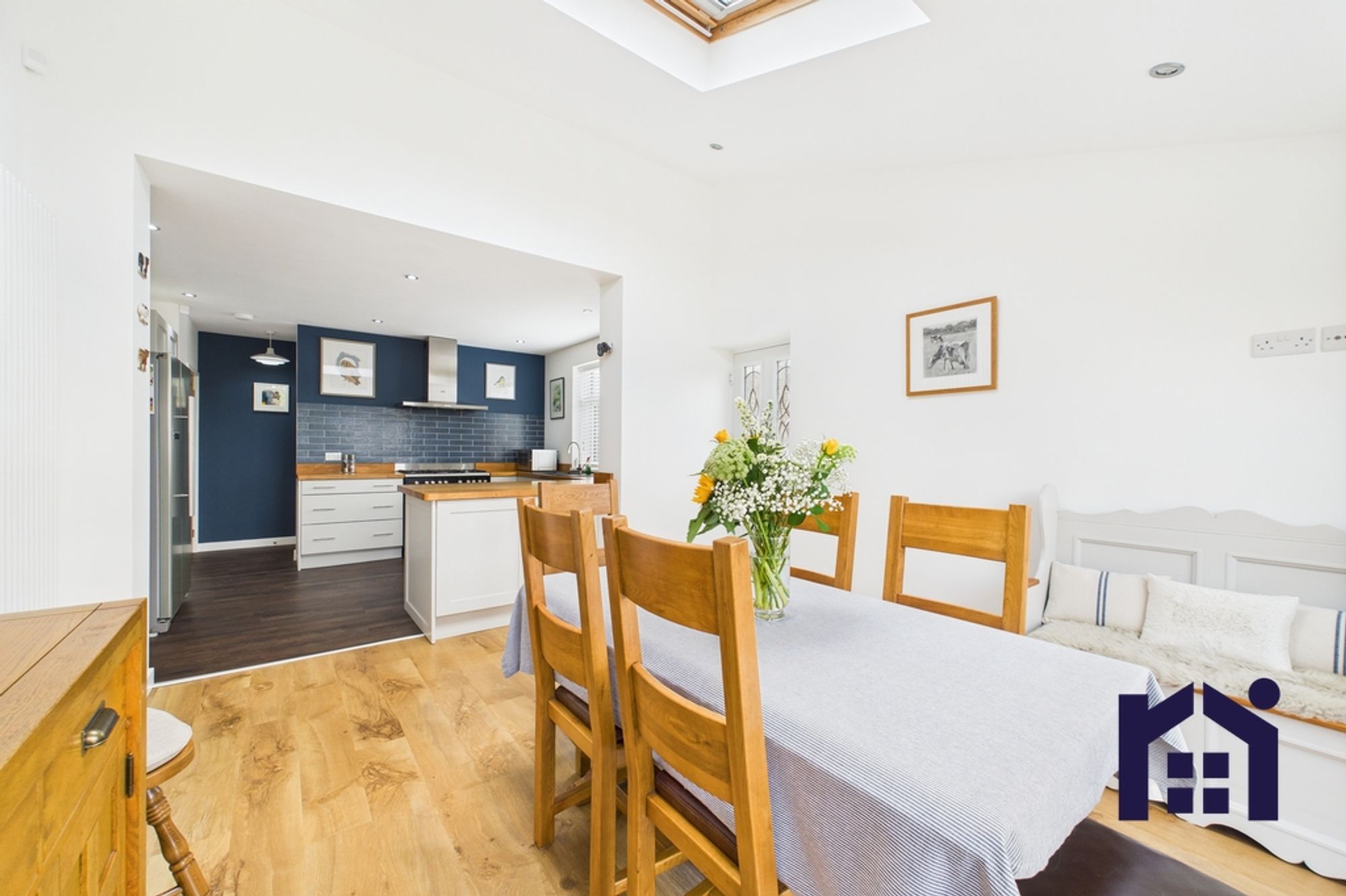 To the front are bedrooms three and four with the smaller currently enjoying life as a home office/snug. To the rear, the serene living room flows into the garden room with vaulted ceiling and plenty of natural light from patio doors and Velux windows.