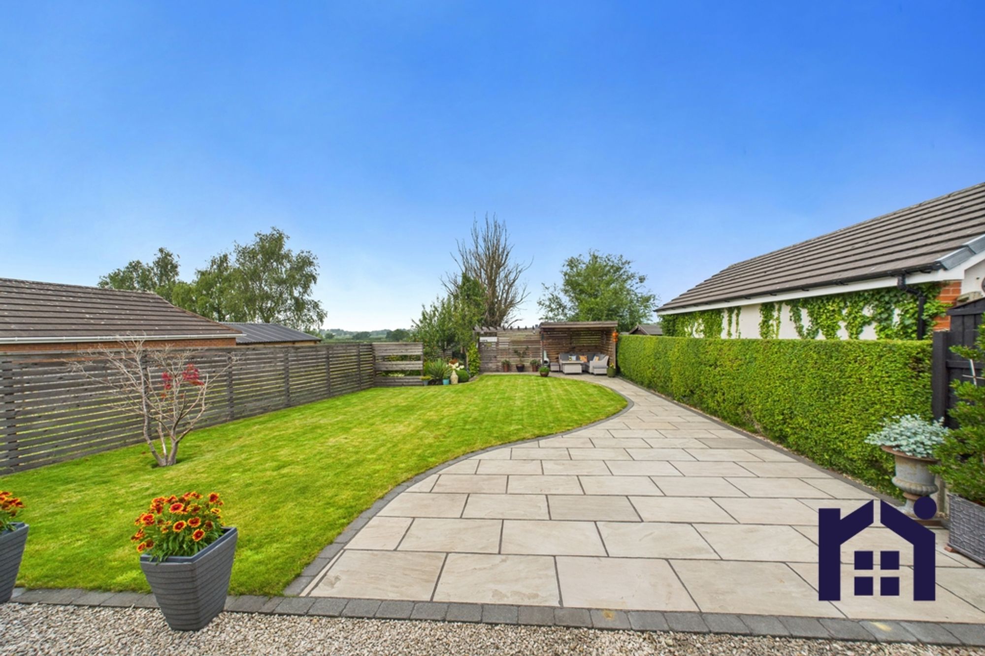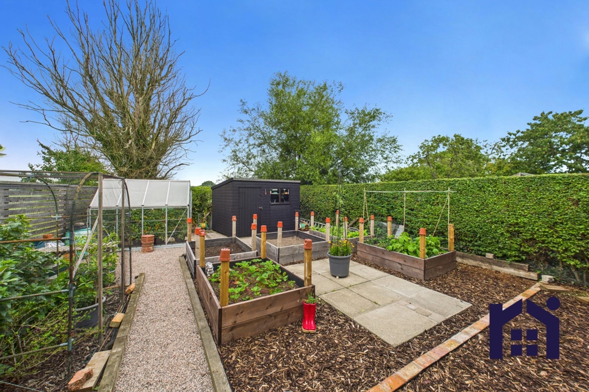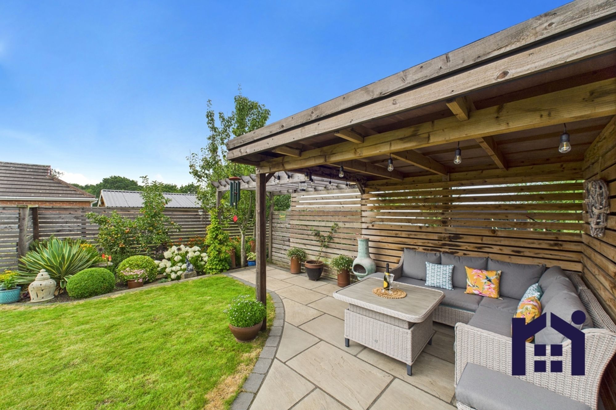 Step outside into the gorgeous garden with Indian stone sun terrace following the curve of the lawn to a covered pergola making this the perfect place to relax and entertain. With abundant planting the borders contain apple and pear trees, herbaceous shrubs and a secret door opens to a delightful productive area with raised beds, greenhouse, shed and views over fields and trees.