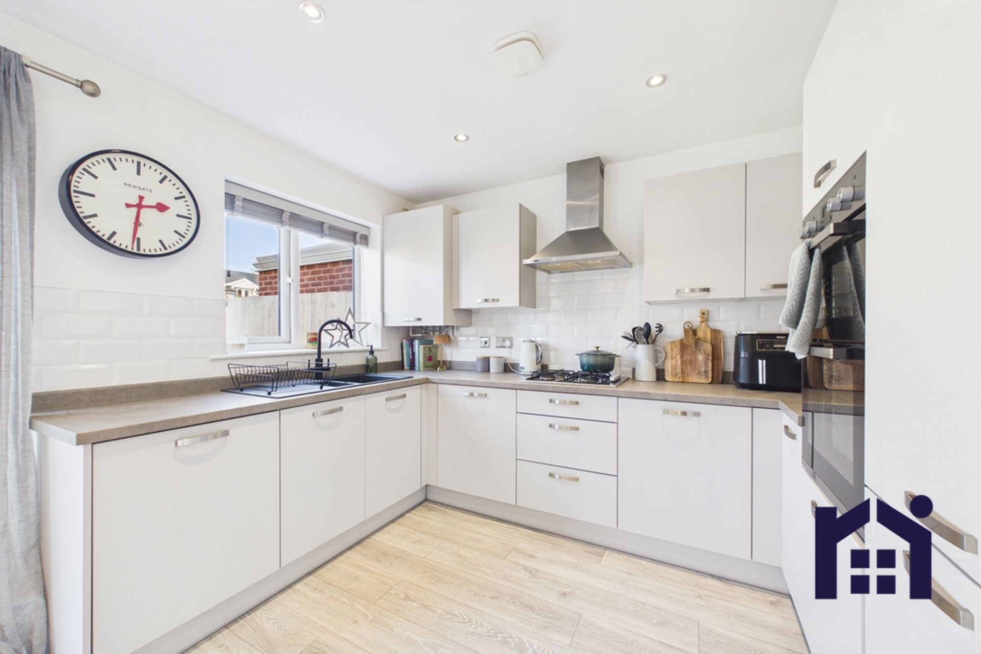 To the front, the driveway provides parking for two vehicles and leads past the garden to the main entrance. Step into the welcoming hallway and from there to the serene bay fronted living room, a lovely light-filled space perfect for relaxing. To the rear, the dining kitchen forms the heart of the home and comprises a range of wall and base units with integrated appliances including gas hob, double electric oven and grill, dishwasher and washing machine, with patio doors opening out to the garden and allowing plenty of natural light to flow through the space. Completing the ground floor is the cloakroom with wc and wash hand basin.
